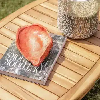 קווים רכים ונמוכים יוצרים תחושת מרחב גם בחצרות קטנות, והשולחן האובלי מאפשר סירקולציה טבעית של תנועה.