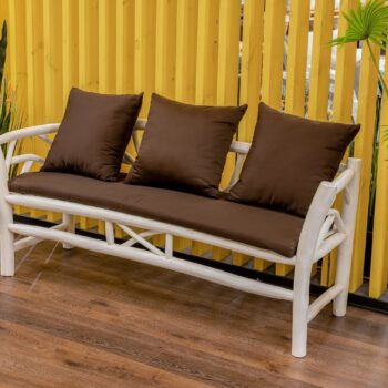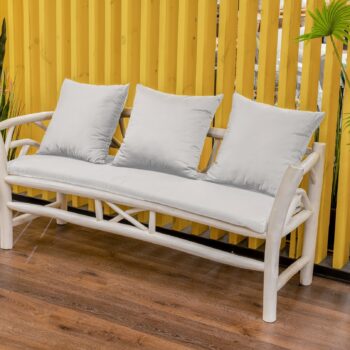 הספסל בנוי מענפי עץ טיק צבועים בלבן עתיק.