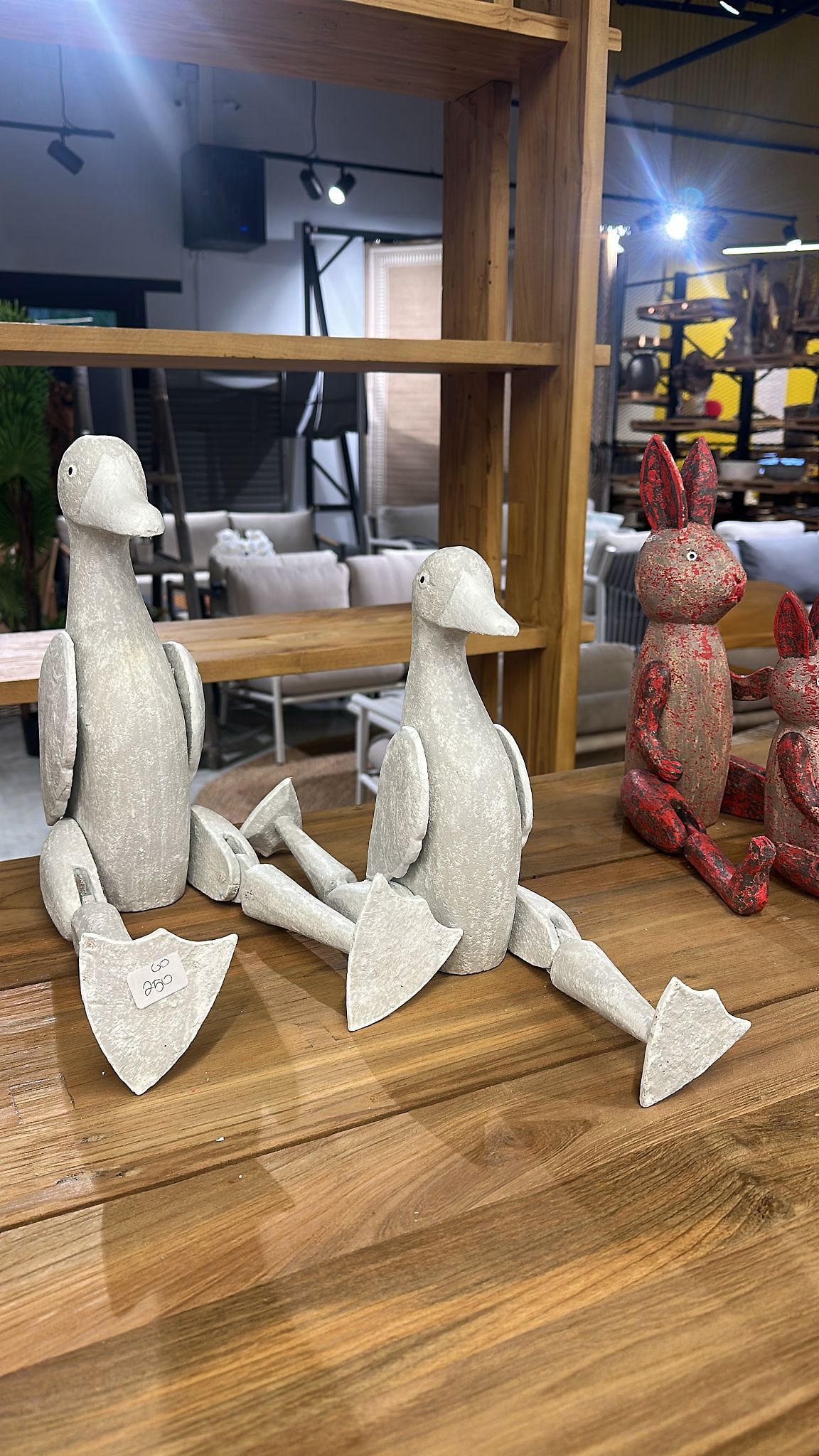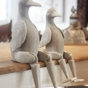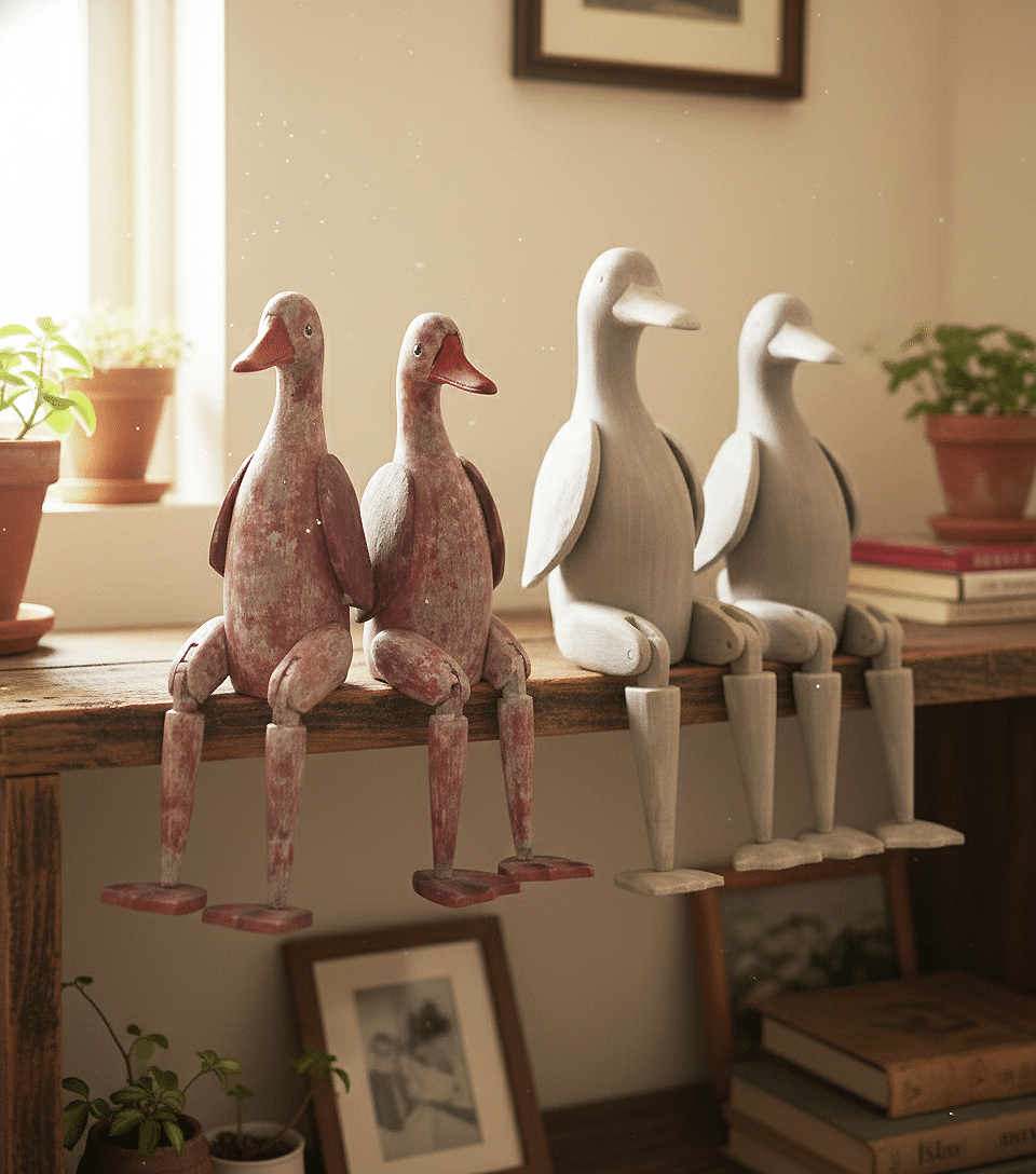 גמישות בעיצוב: לברווזים רגליים מתכווננות המאפשרות להושיב אותם בנחת על המדף, על קצה השולחן או בשידה.