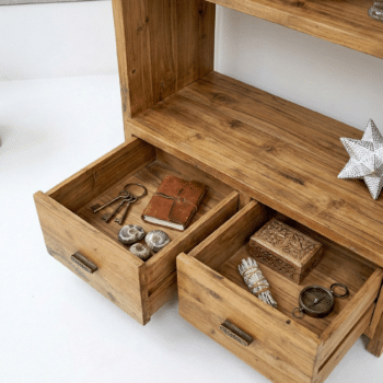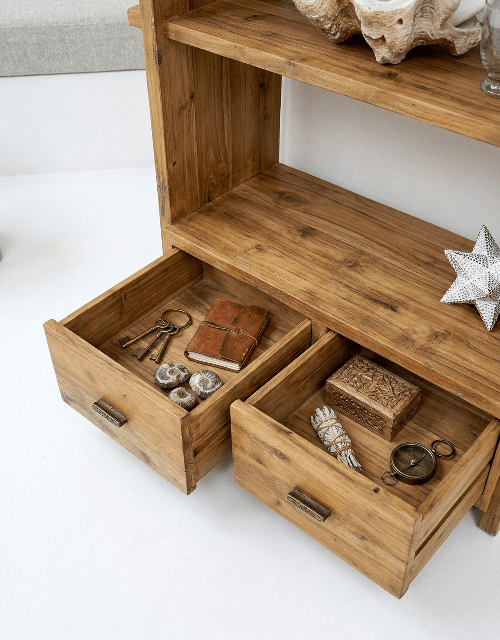 שפע מקום אחסון: מדפים מרווחים ושתי מגירות.