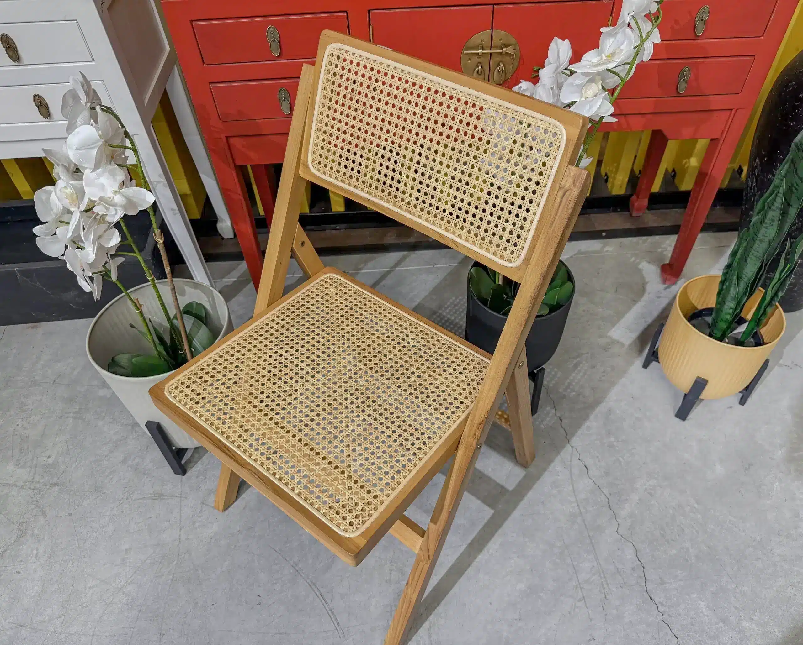 כיסא מתקפל מעוצב עם שזירה אומנותית של ראטן טבעי דגם קמרון.