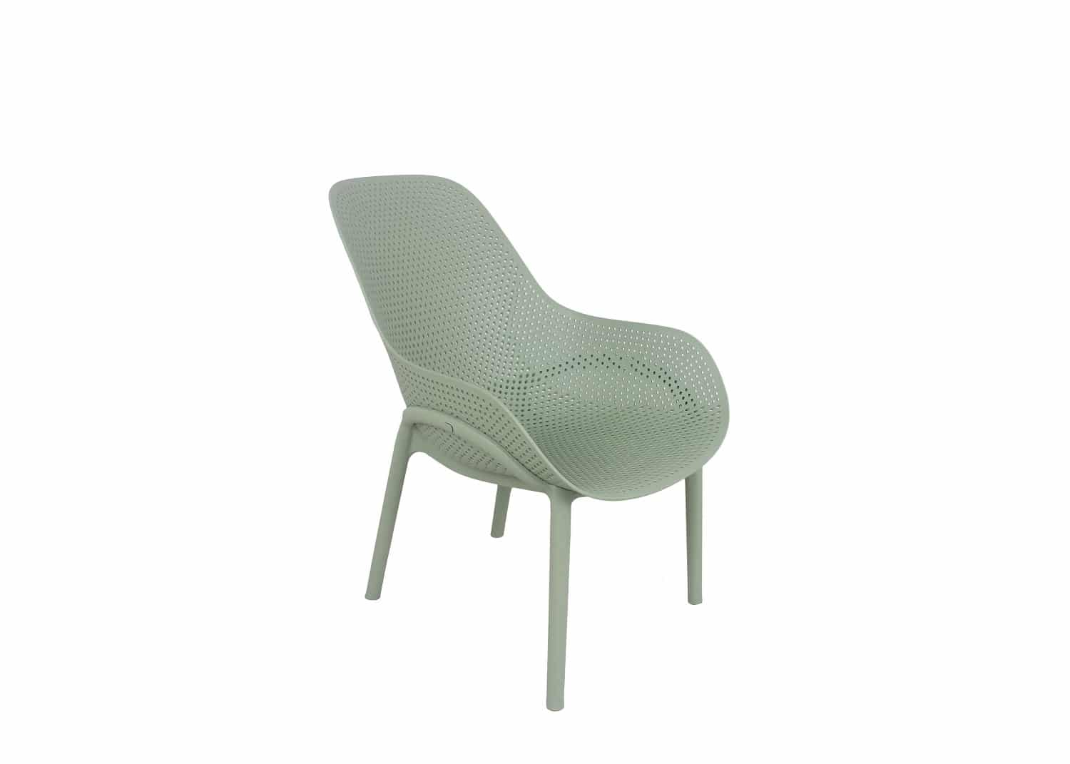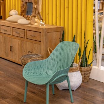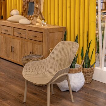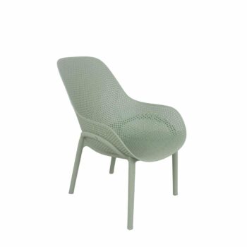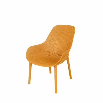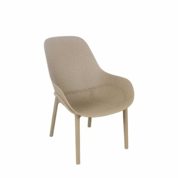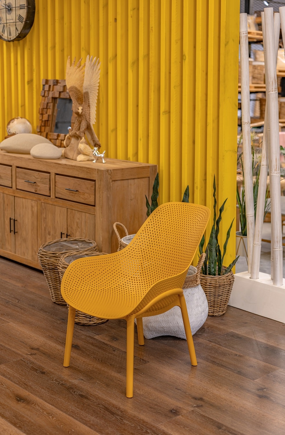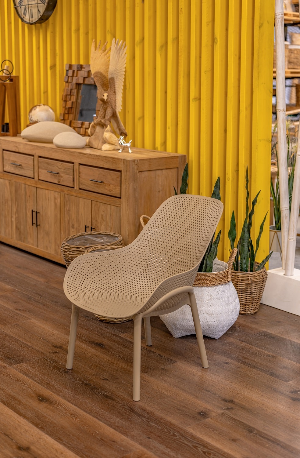 כיסא נמוך ומעוצב הבנוי מפלסטיק קשיח ומסיבי.