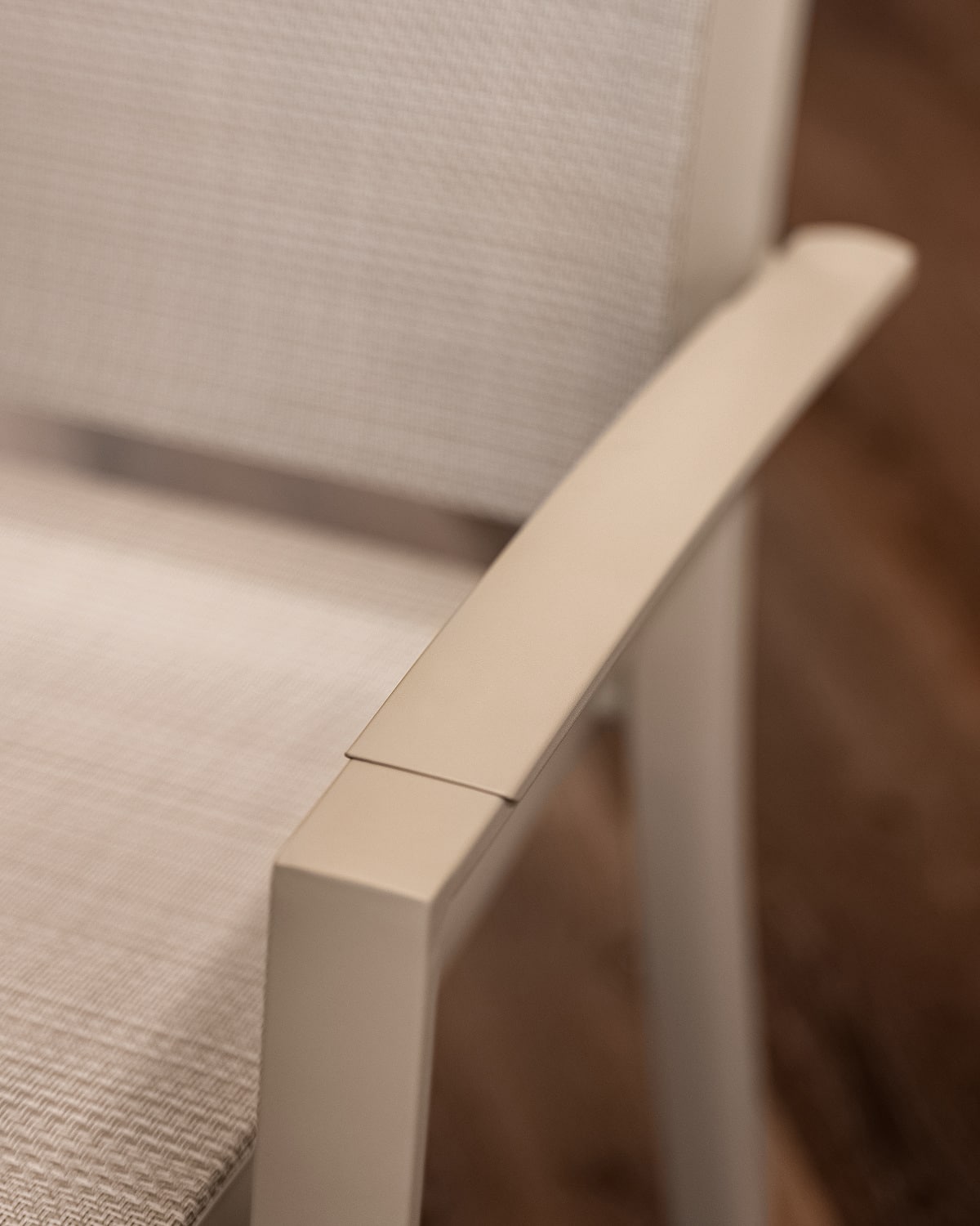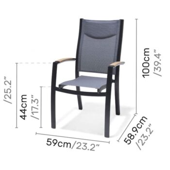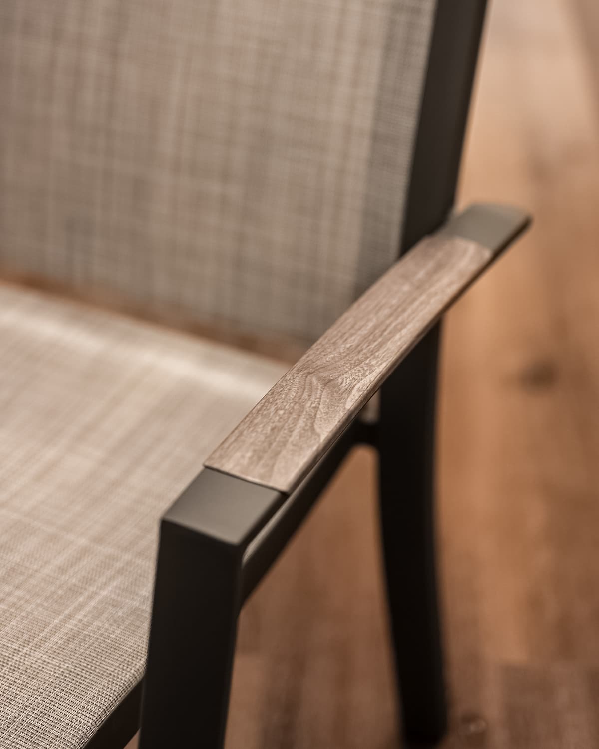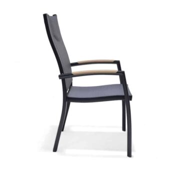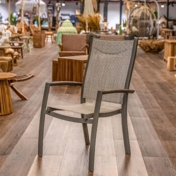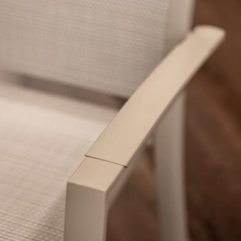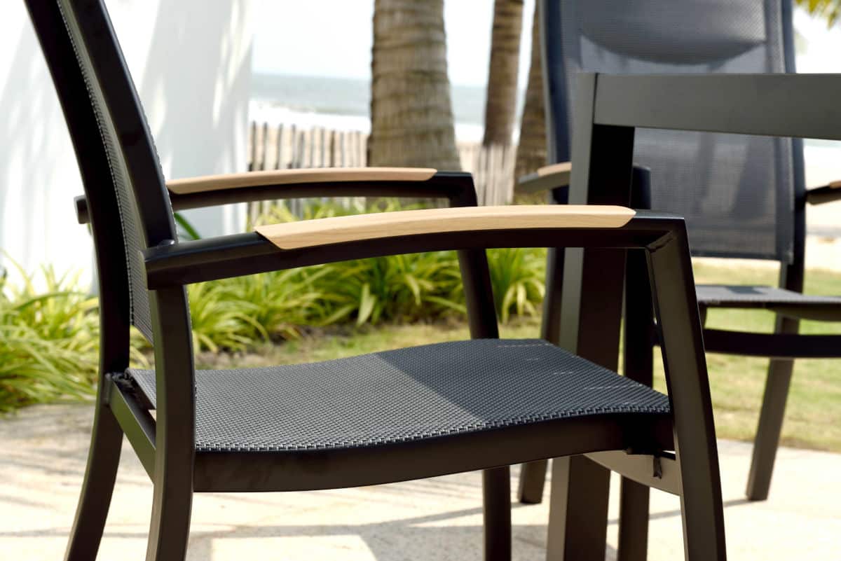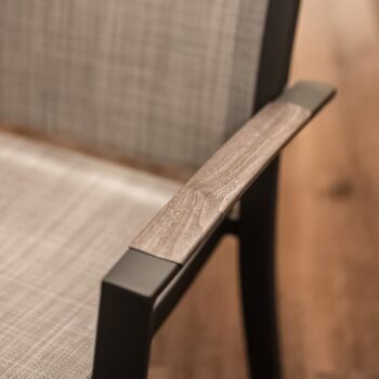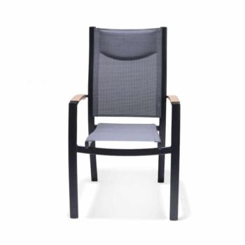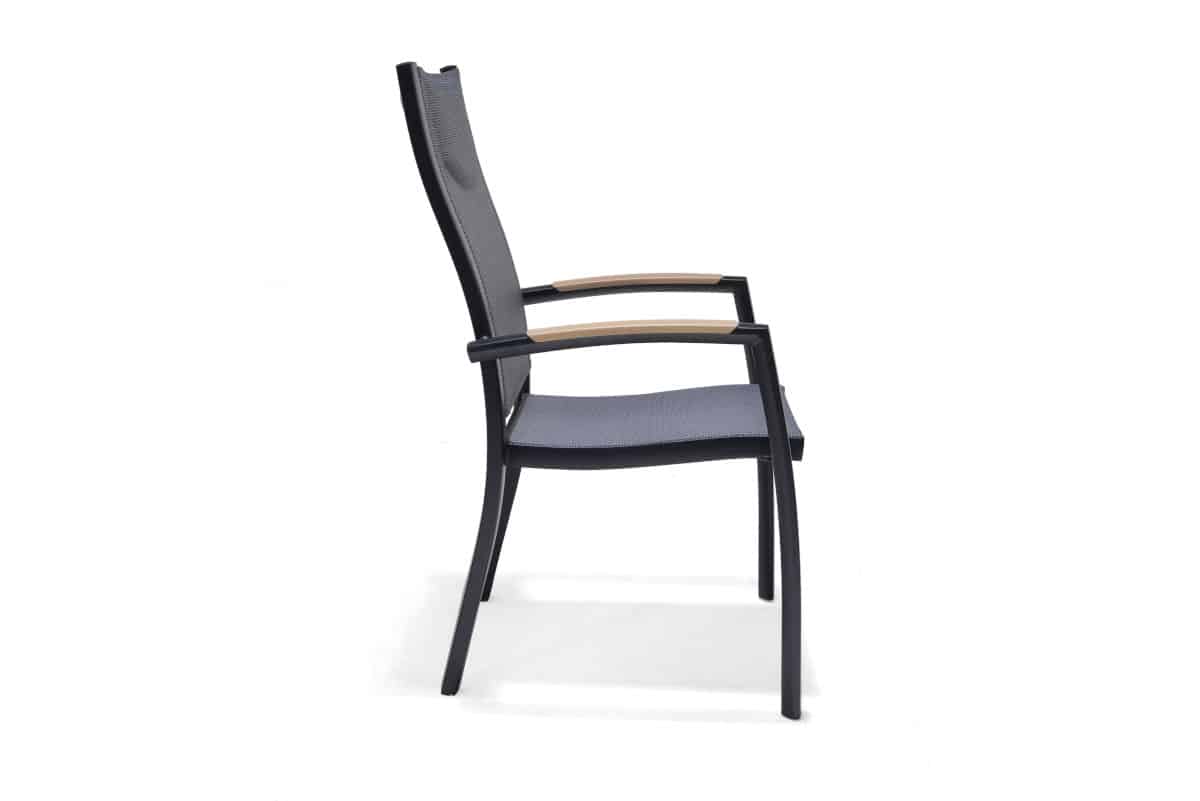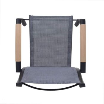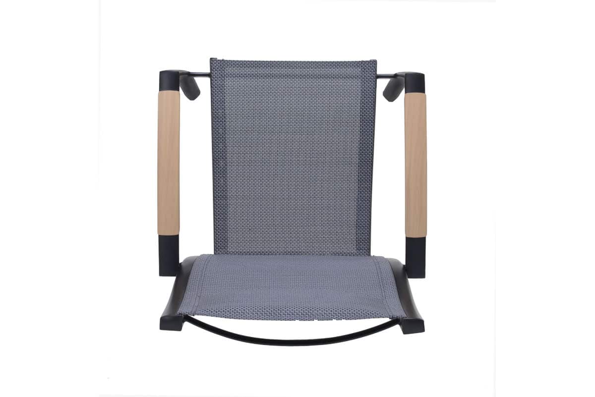 הכיסא עשוי אלומיניום “אל חלד” וכולל משענות יד עם טקסטורת דמוי עץ (תלוי צבע) – שילוב של מראה חם עם חומר עמיד במיוחד.