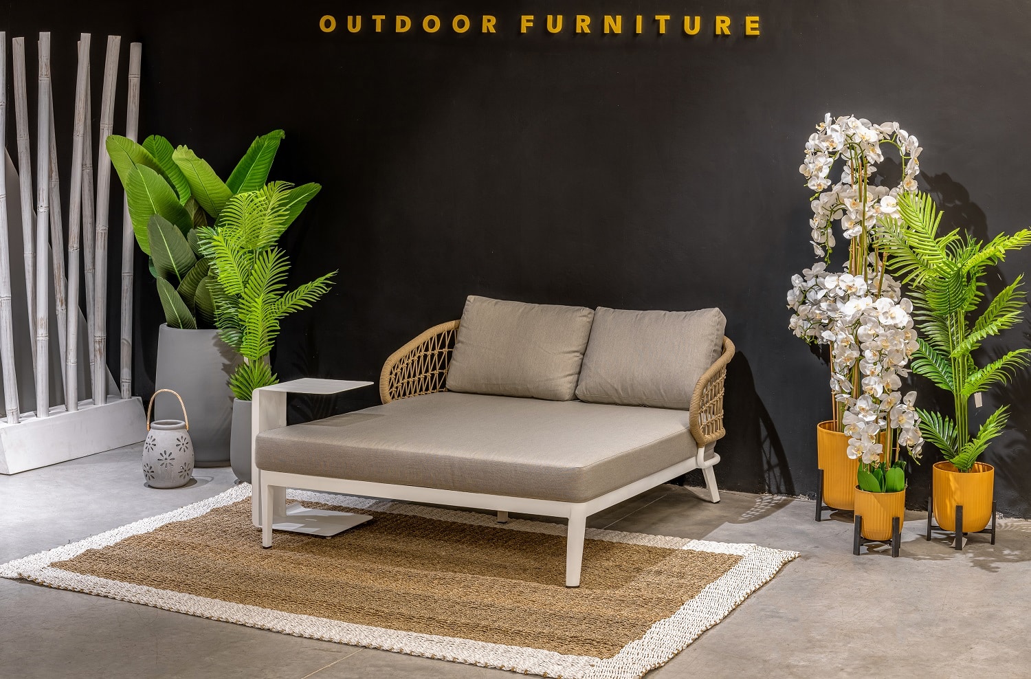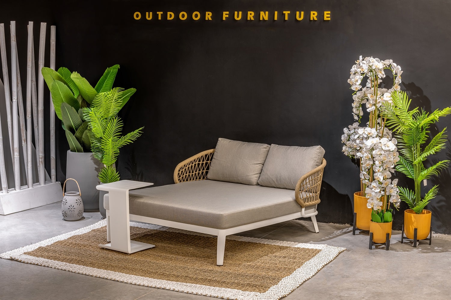 מסגרת לבנה, חבלים דמוי טבעי, ריפוד אפור קרם.