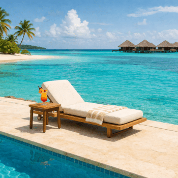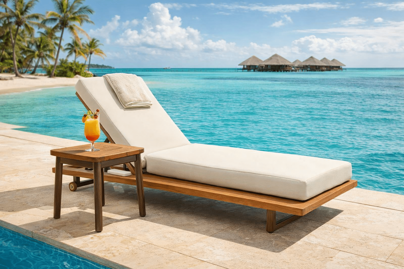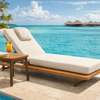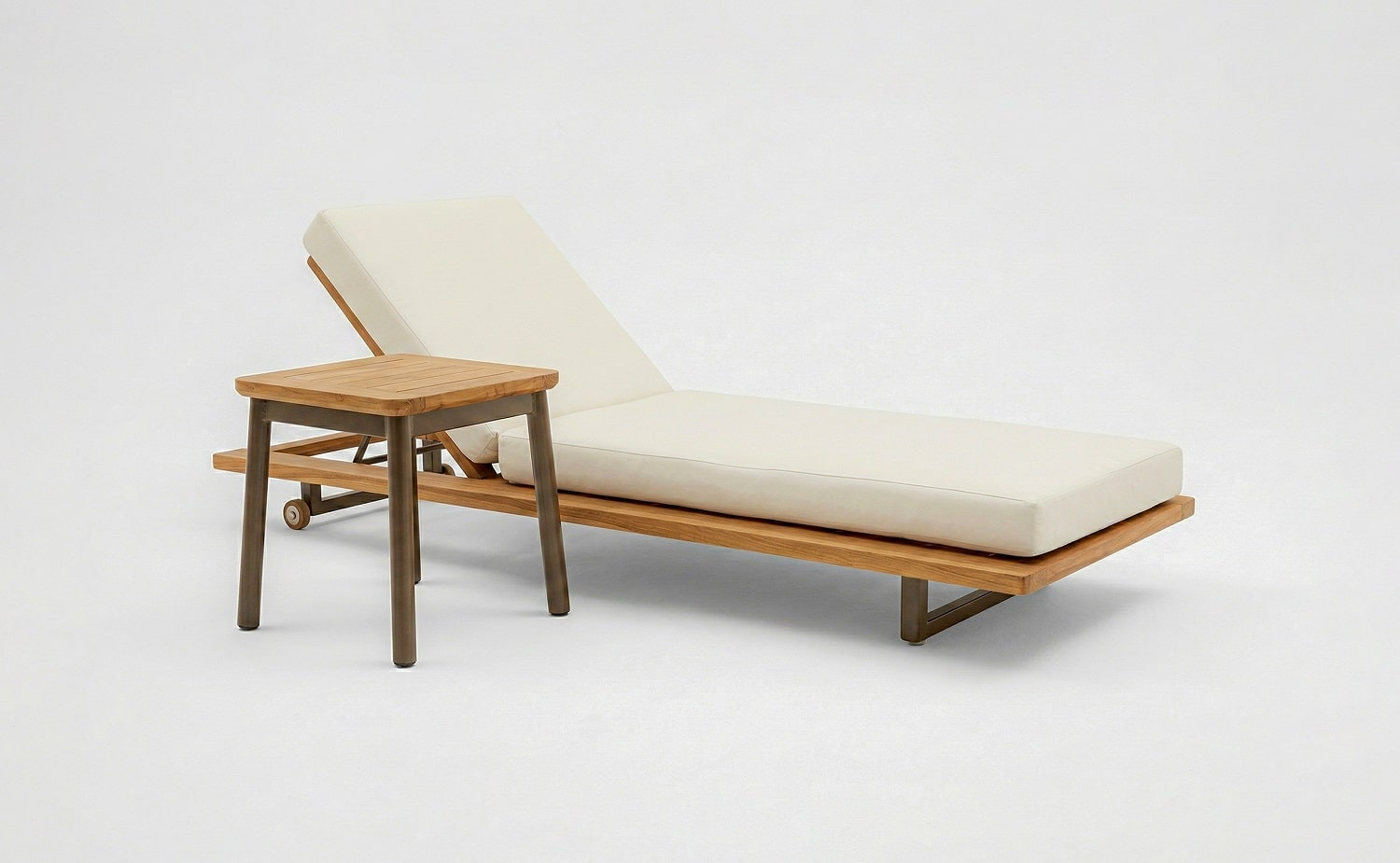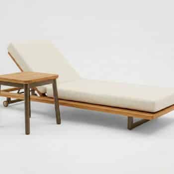 מיטת השיזוף מתאפיינת בשילוב של עץ טיק טבעי ואלומיניום בגוון חום אפור וריפוד חוץ יוקרתי.