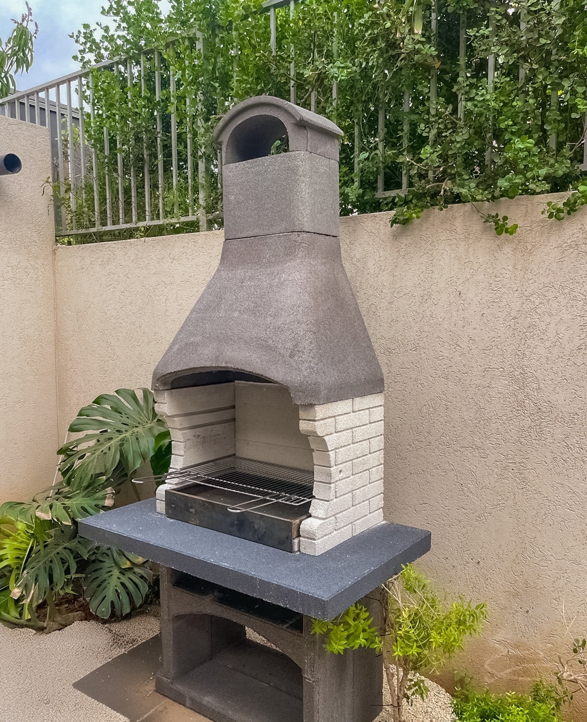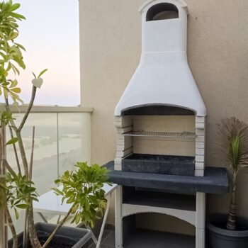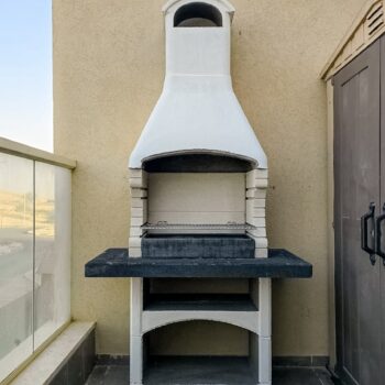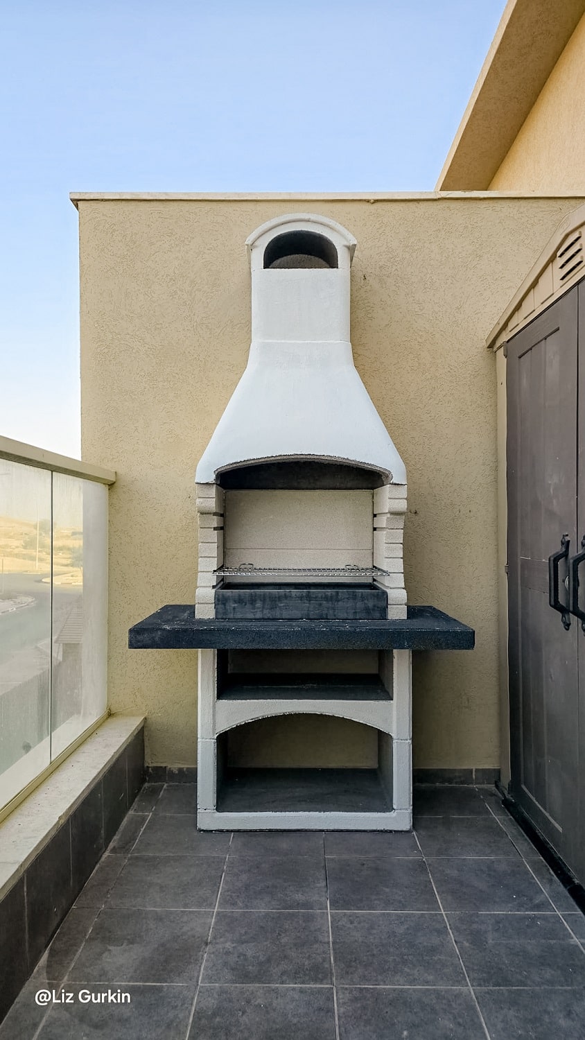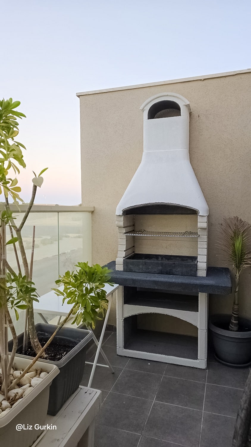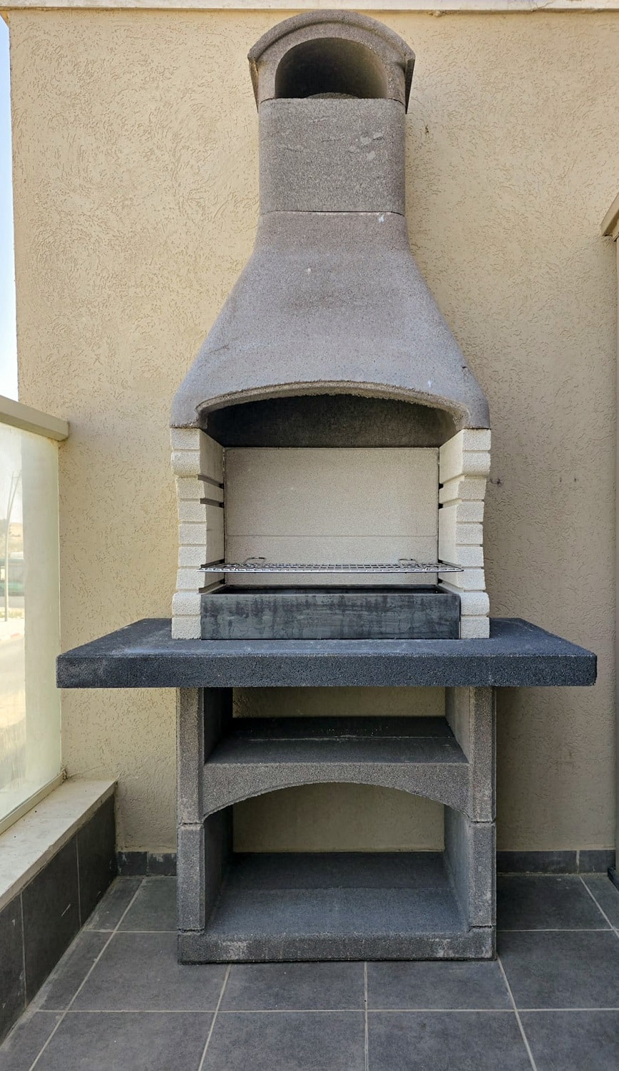 משטח עבודה בגימור גרניט בצבע לבן עתיק. שאר המנגל מגיע בצבע אפור טבעי להשלמת המראה.