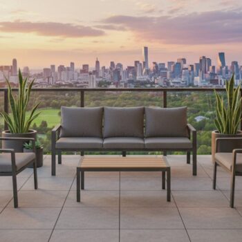 סט ישיבה אשר בנוי משלדת אלומיניום ” אל חלד” בעיצוב מינימליסטי מוקפד ונוחות מרבית.