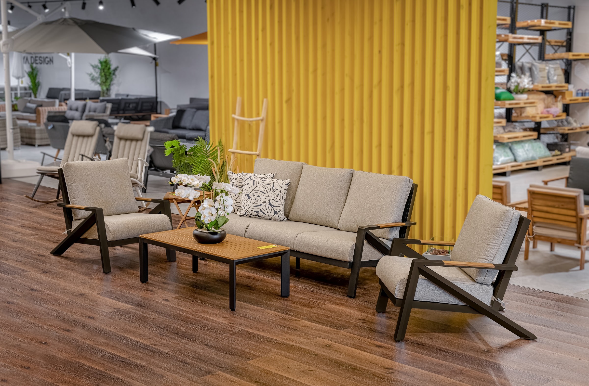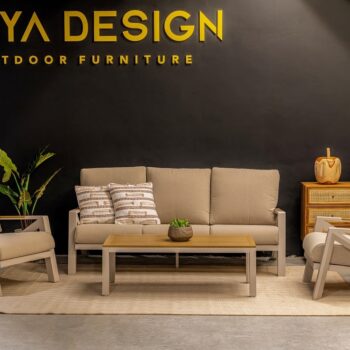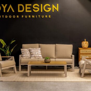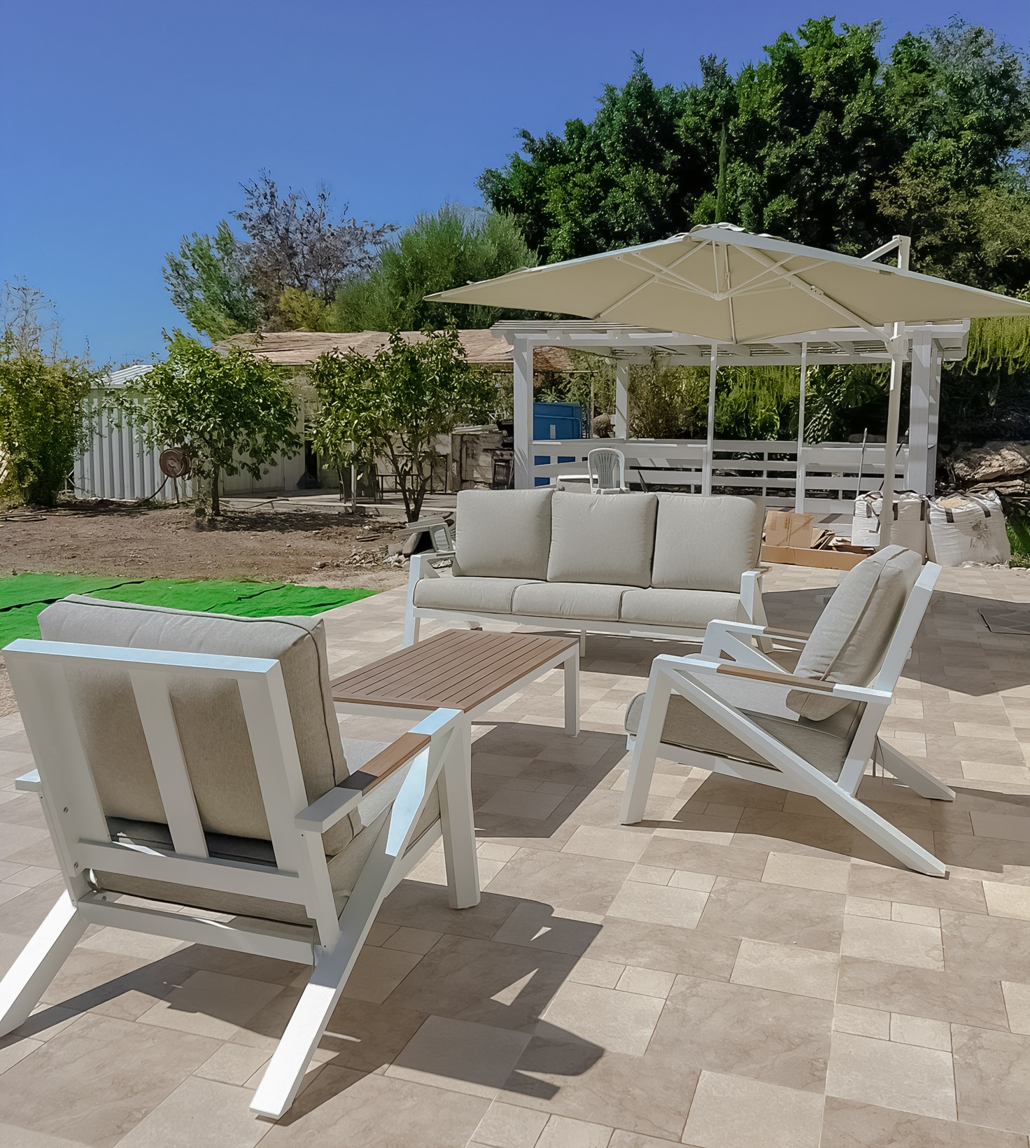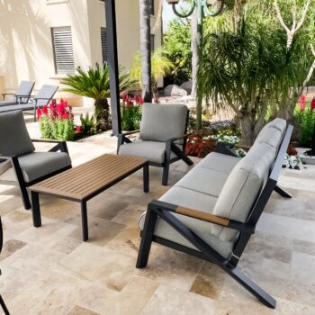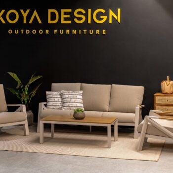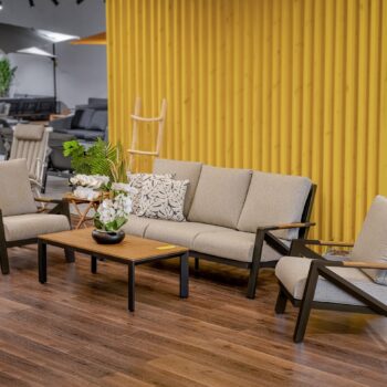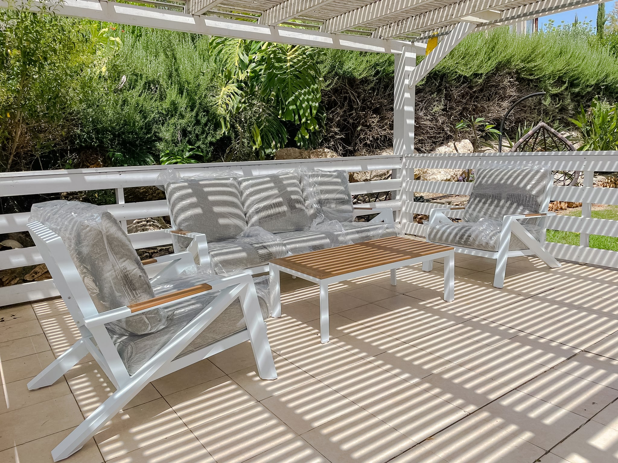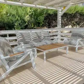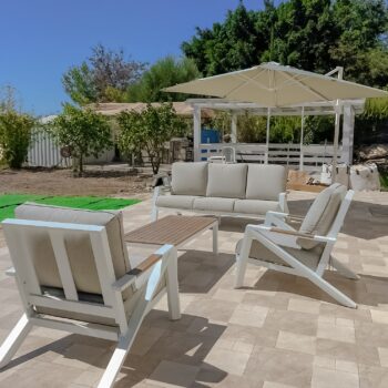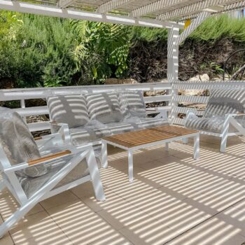 מערכת ישיבה מאסיבית מאלומיניום “אל חלד” לגינה או למרפסת בשילוב PVC דמוי עץ.