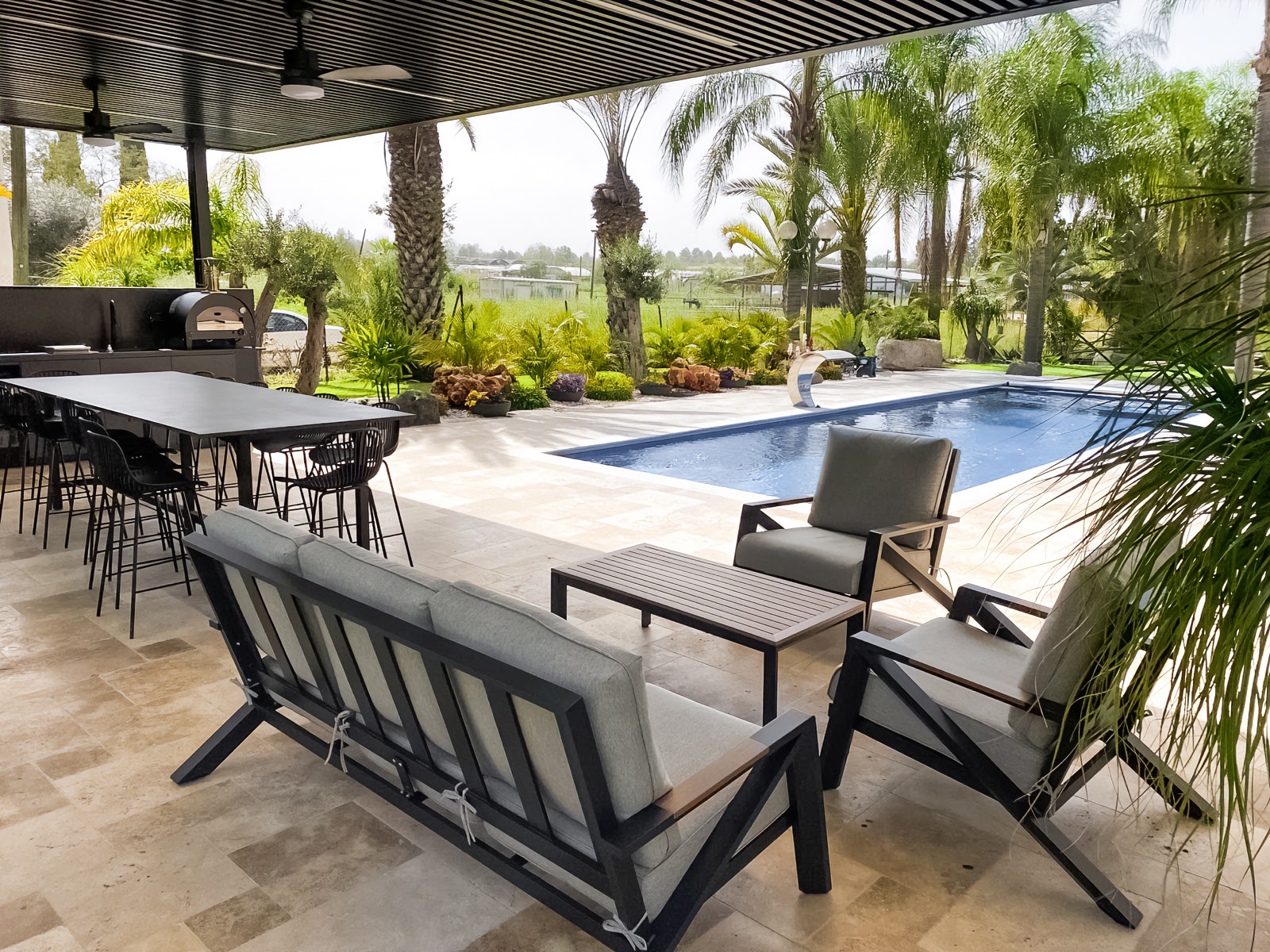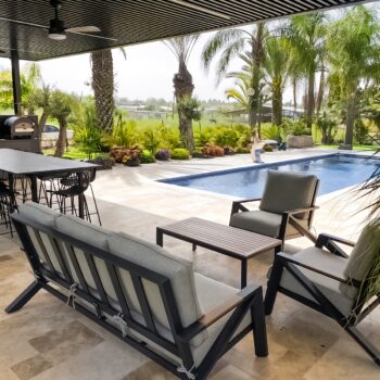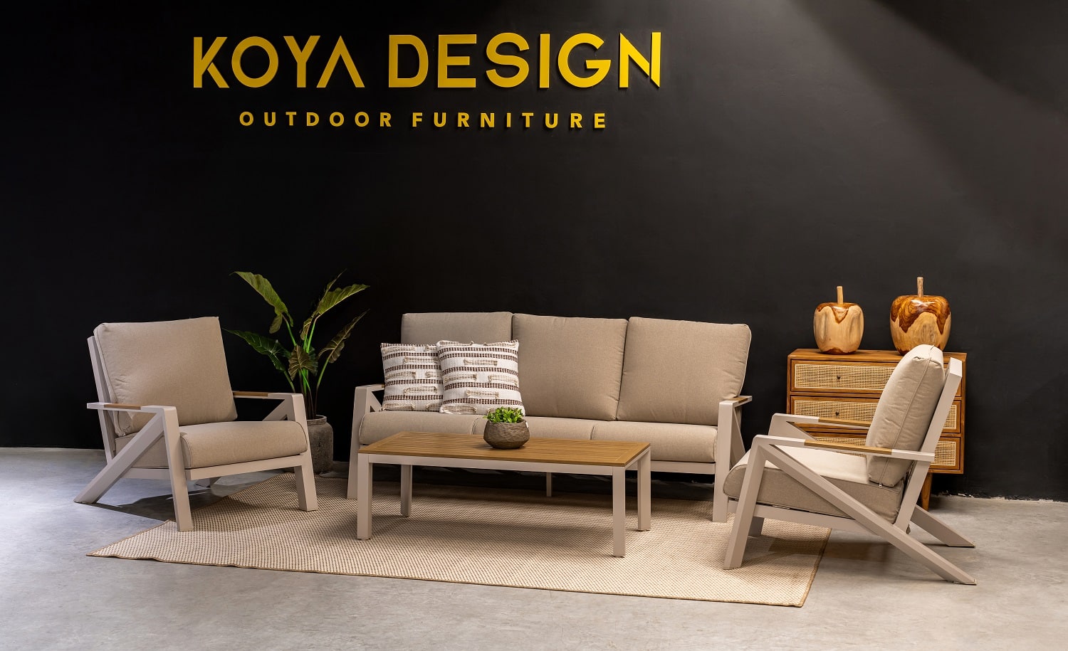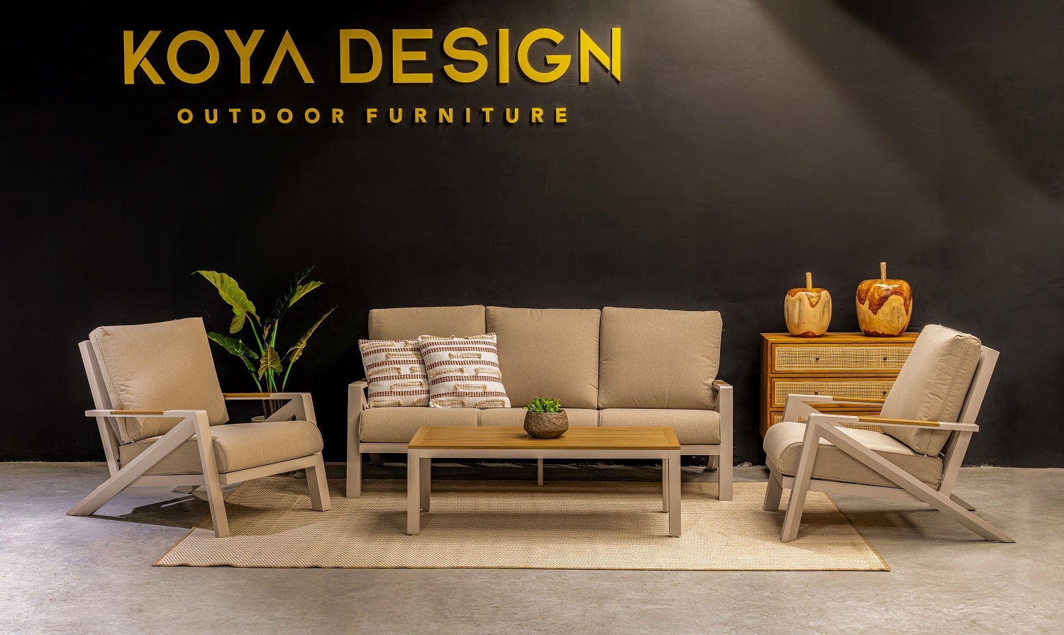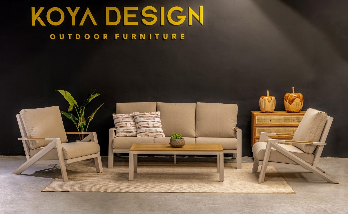 מערכת ישיבה מאסיבית מאלומיניום “אל חלד” לגינה או למרפסת בשילוב PVC דמוי עץ.