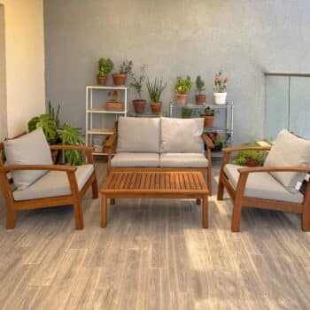 הסט עשוי מעץ אקליפטוס מלא עם אישור FSC בגימור טיק איכותי לשמירה על עמידות ומראה טבעי.
