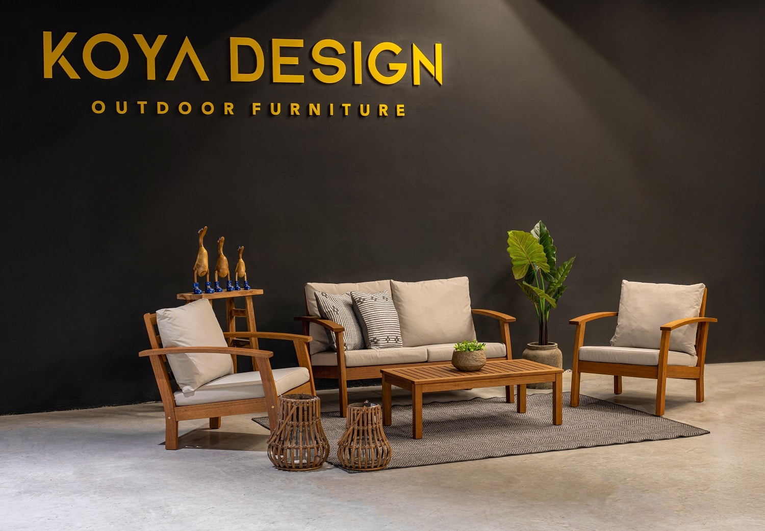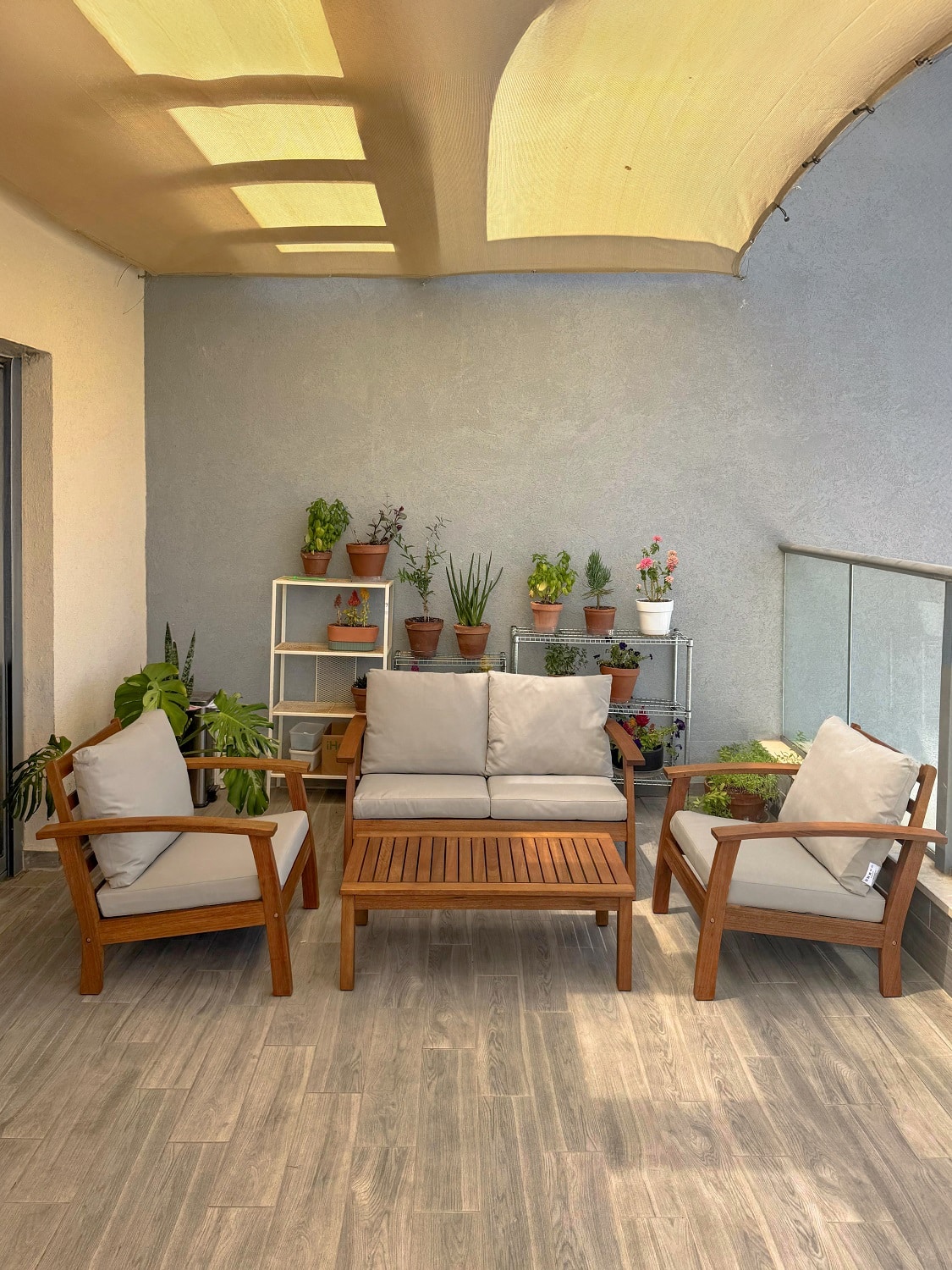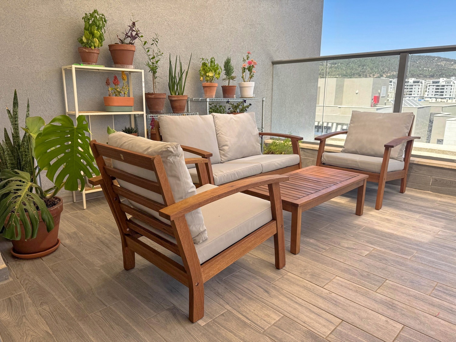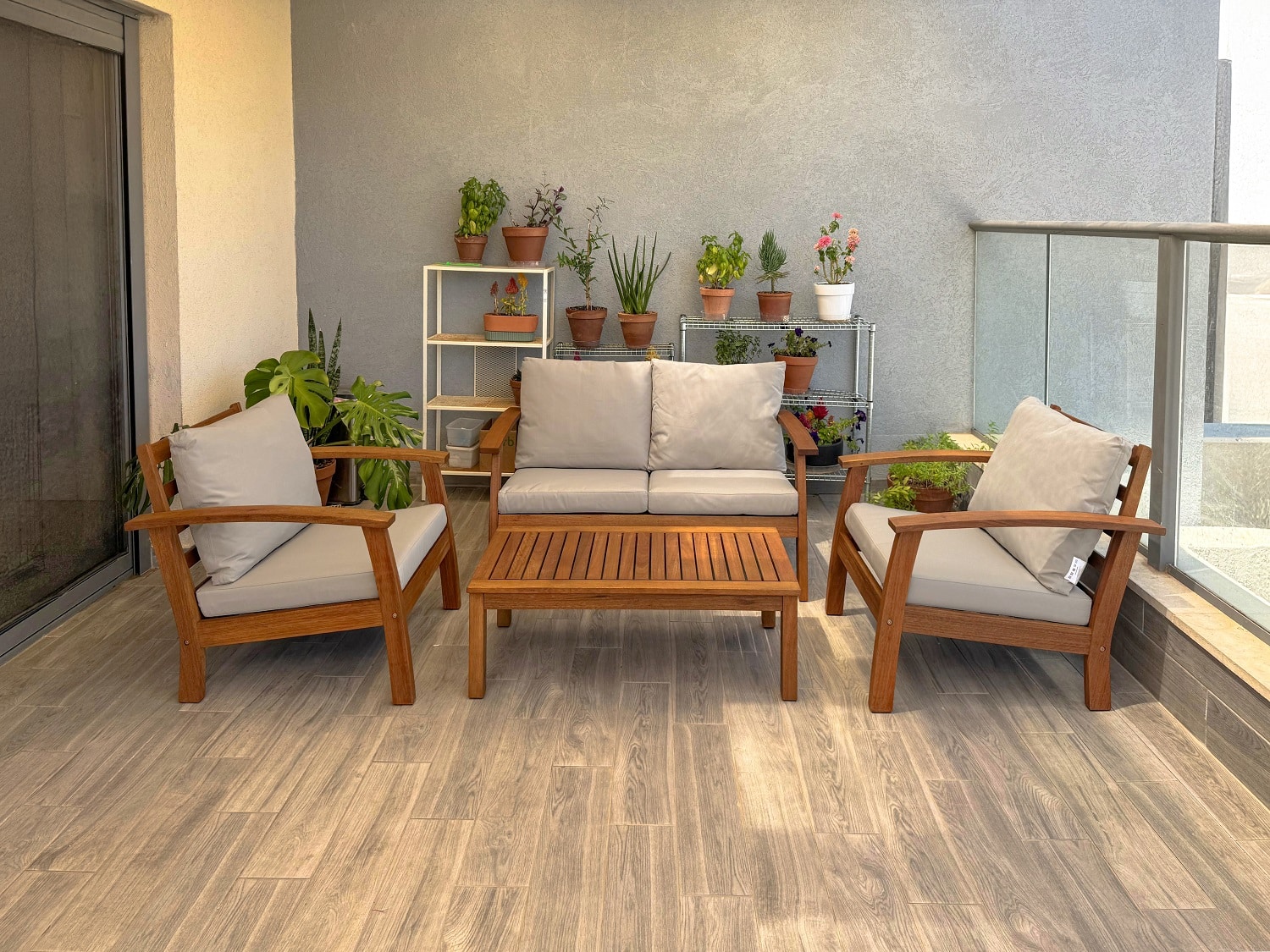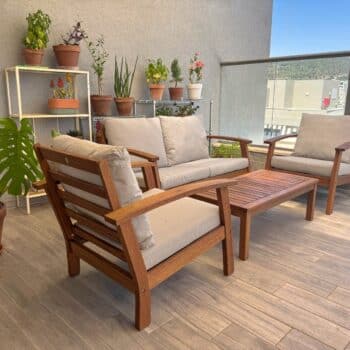 הסט עשוי מעץ אקליפטוס מלא עם אישור FSC בגימור טיק איכותי לשמירה על עמידות ומראה טבעי.