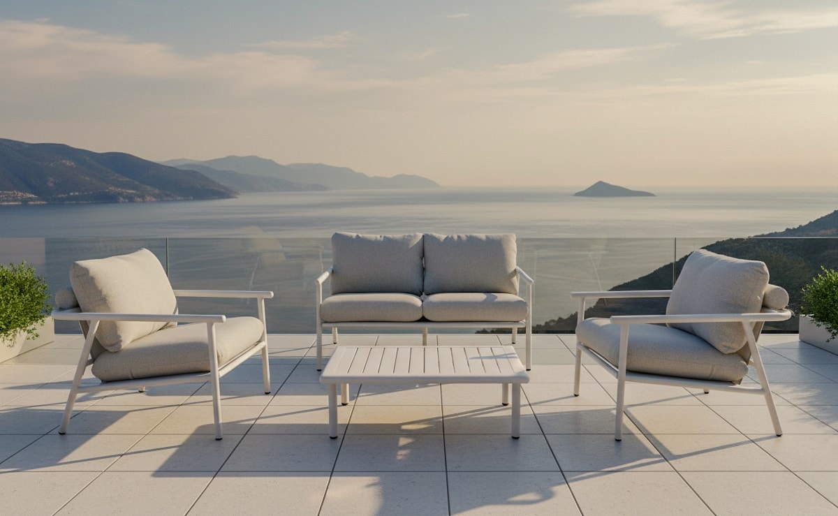 סט ישיבה חוץ במראה טבעי ומעודן, כולל ספה זוגית, שתי כורסאות ושולחן קפה.