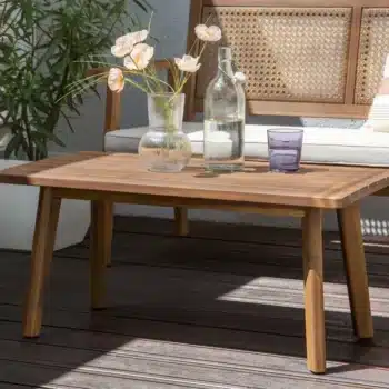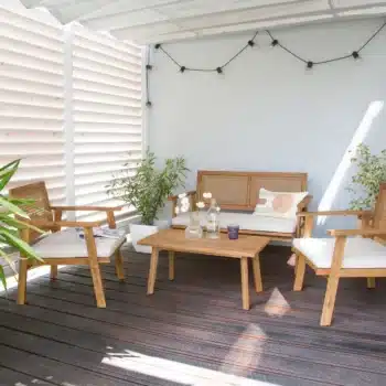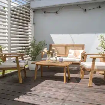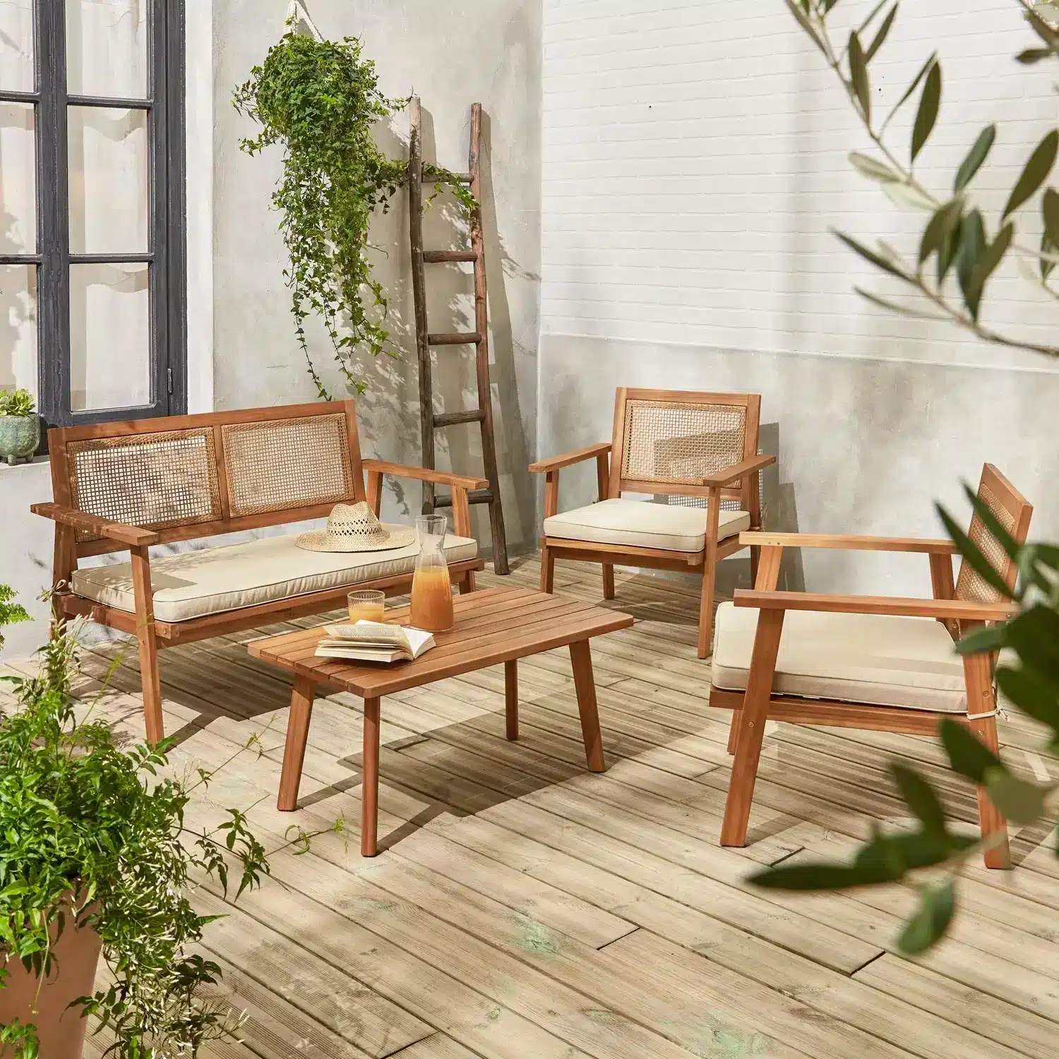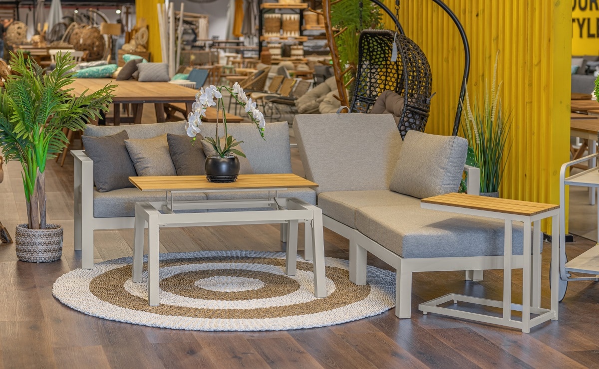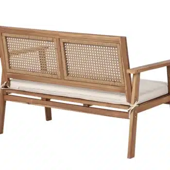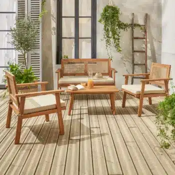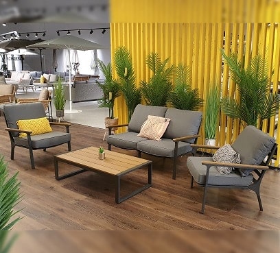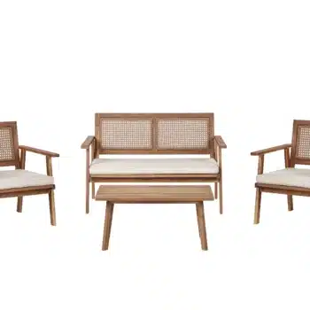 מערכת ישיבה מעוצבת לגינה הבנויה מעץ שיטה מלא בשילוב ראטן סינטטי PVC איכותי.