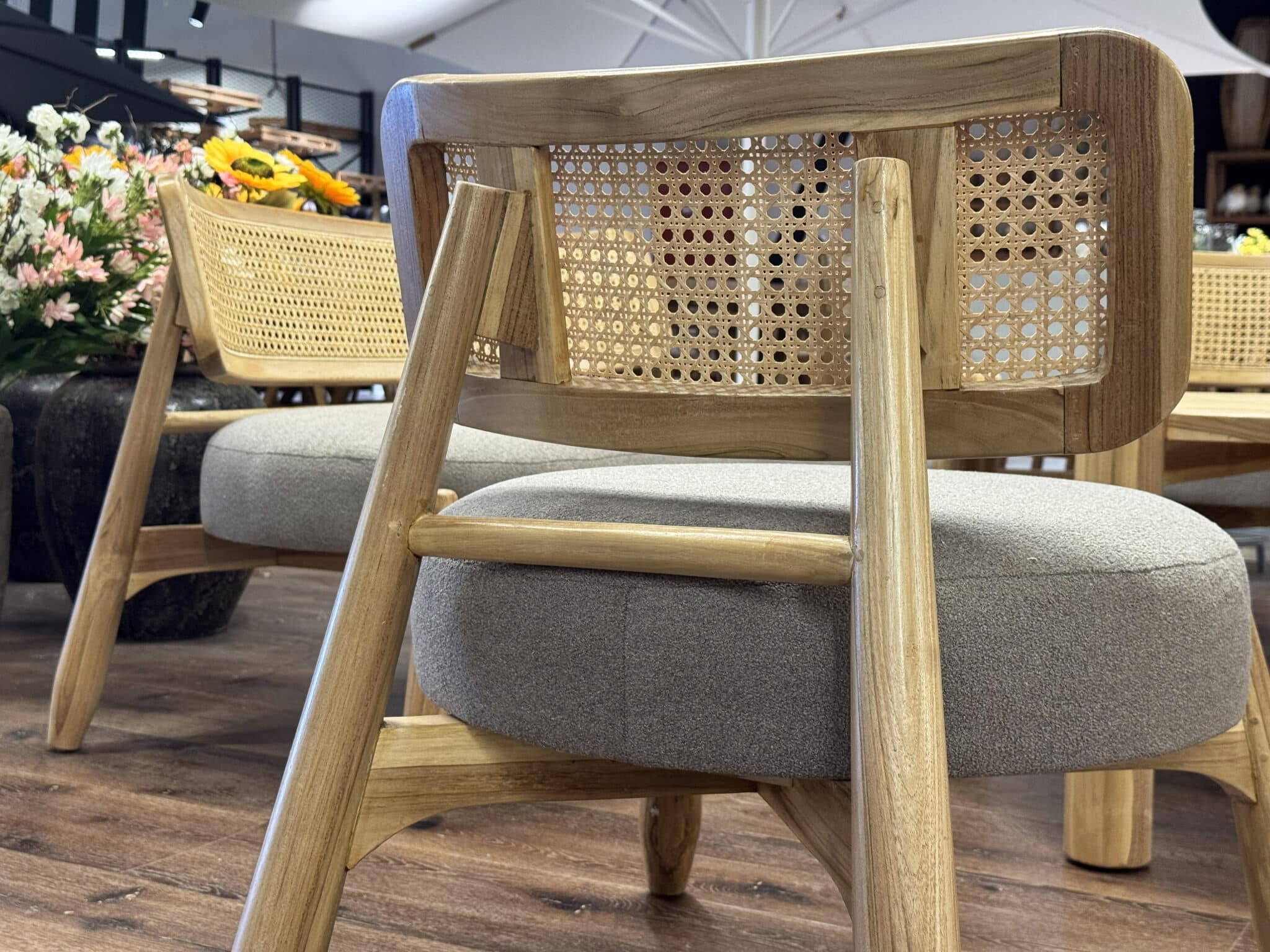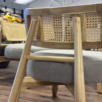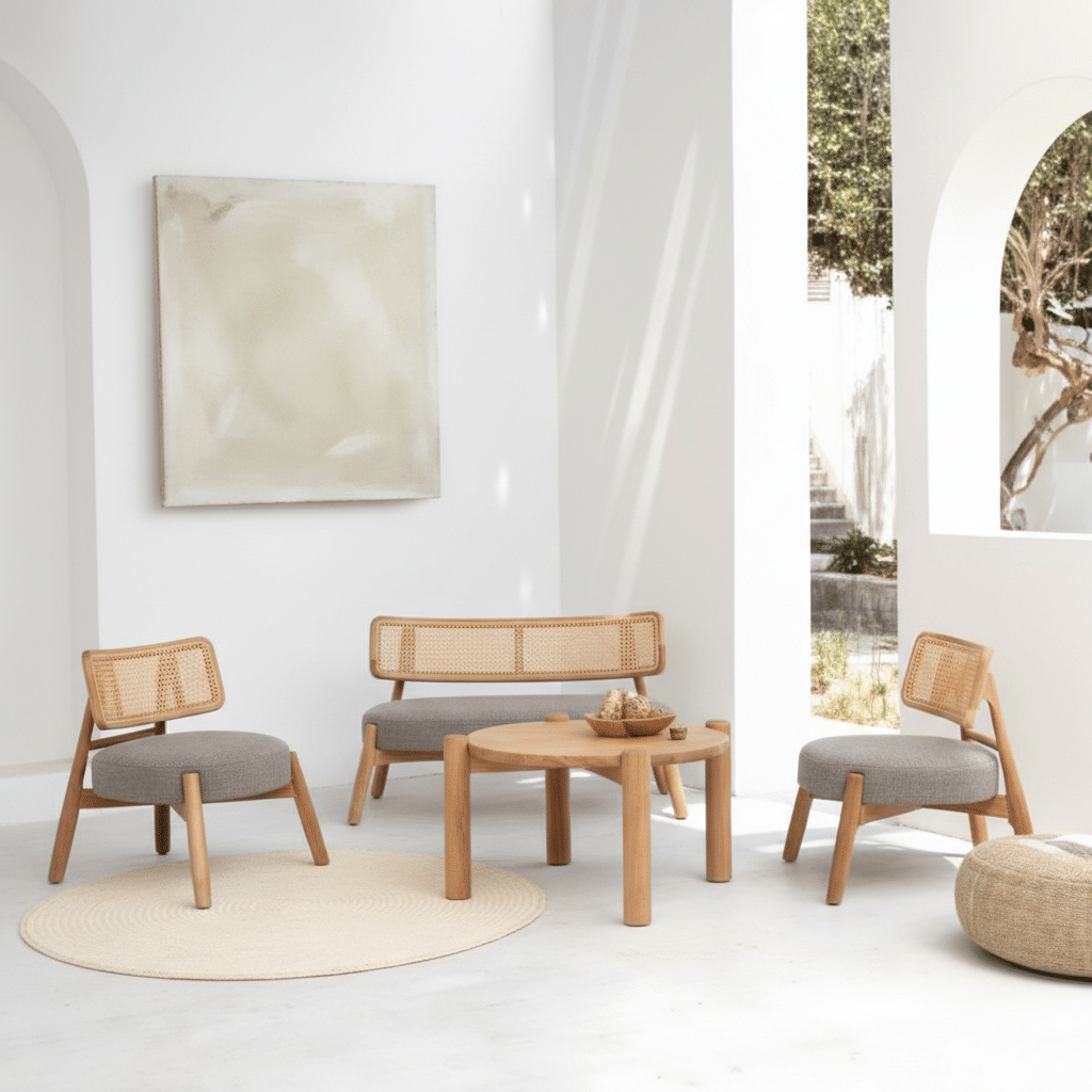 מערכת ישיבה מעוצבת מעץ טיק בשילוב ראטן סינטטי PVC איכותי.