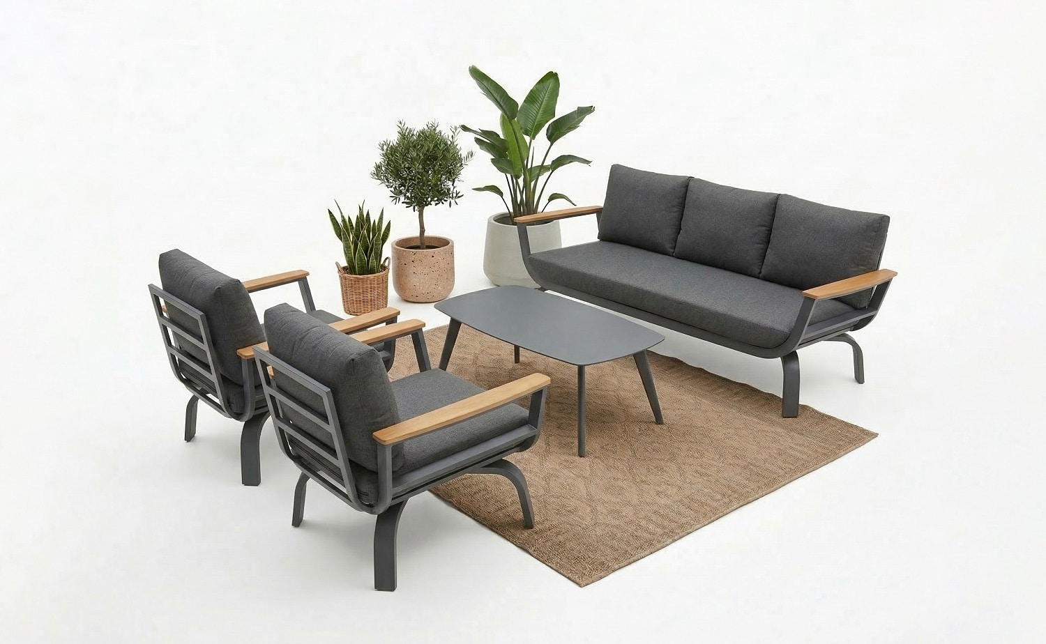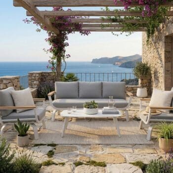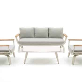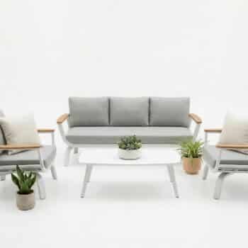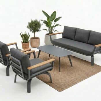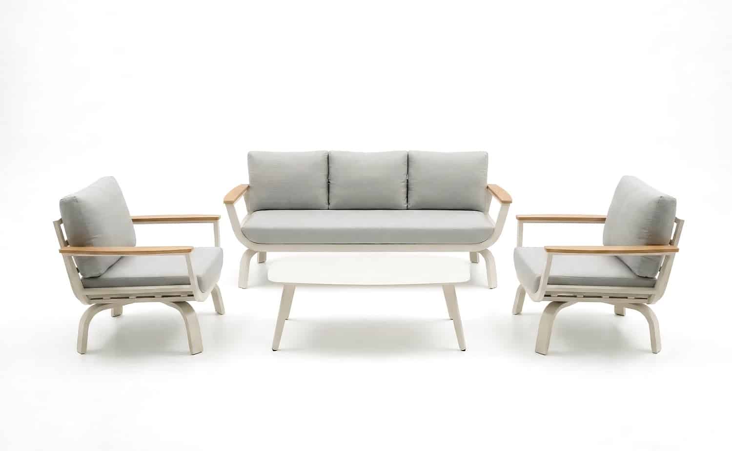 מערכת ישיבה נוחה במיוחד הבנויה משלדת אלומיניום “אל חלד” בשילוב ידיות גדולות ורחבות PVC דמוי עץ טיק.