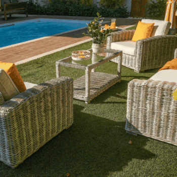 סט ורונה כולל ריהוט גן יוקרתי בעיצוב טבעי עם נוכחות חמה ומזמינה, המשלב שלדת עץ מהגוני