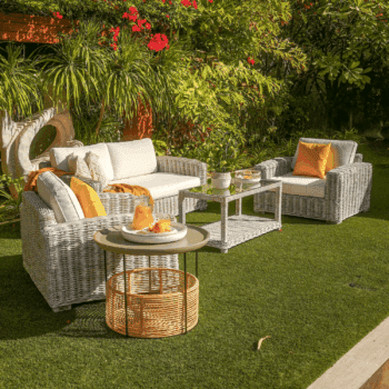 סט ורונה כולל ריהוט גן יוקרתי בעיצוב טבעי עם נוכחות חמה ומזמינה, המשלב שלדת עץ מהגוני