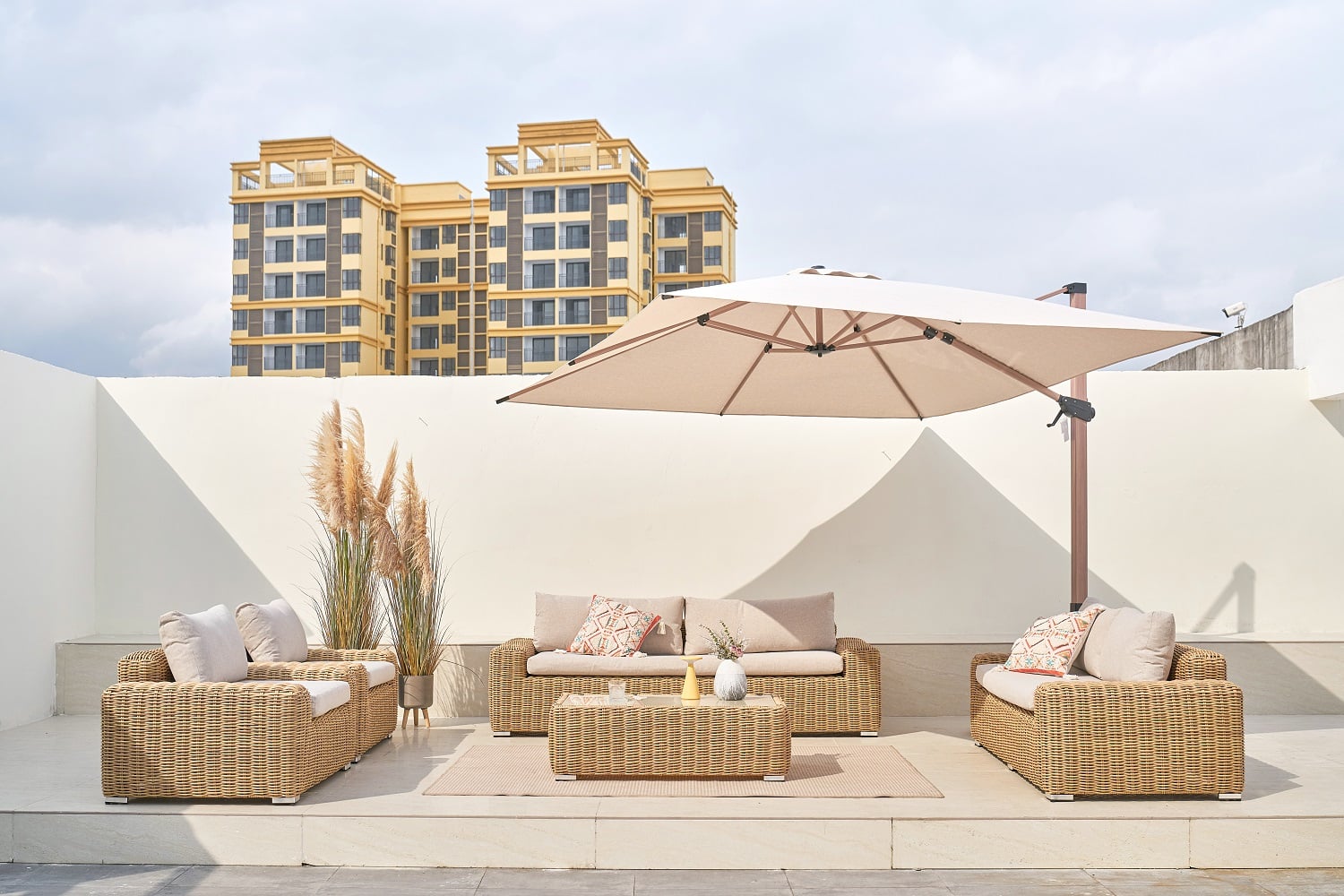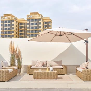 המערכת מורכבת מספת תלת גדולה במיוחד, ספה זוגית + 2 ספות יחיד ושולחן.