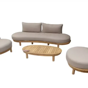 סט ישיבה מפואר לחללי חוץ, בקווים עגולים ורכים, בגימור טבעי שמביא איזון בין נוחות לבין מראה מעוצב ומעודכן.