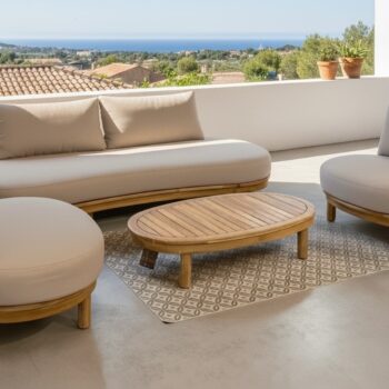 קווים רכים ונמוכים יוצרים תחושת מרחב גם בחצרות קטנות, והשולחן האובלי מאפשר סירקולציה טבעית של תנועה.