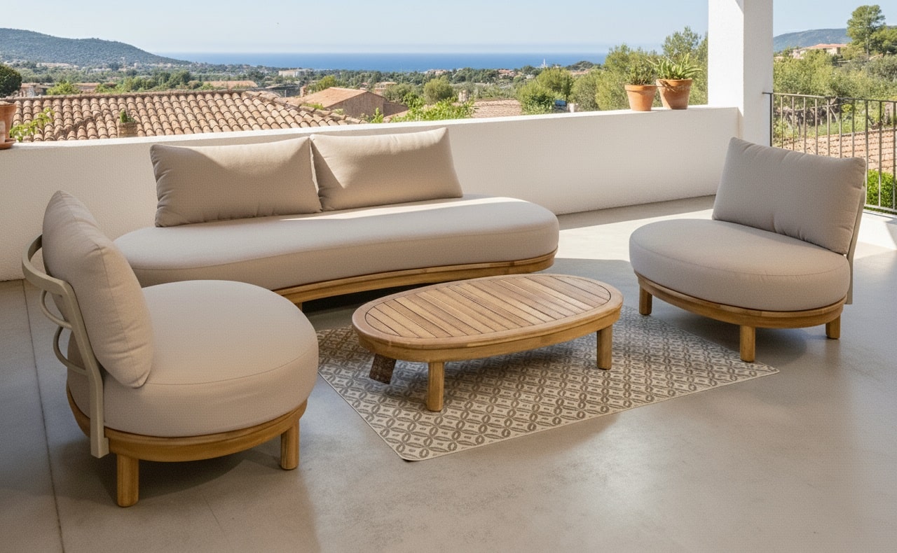 קווים רכים ונמוכים יוצרים תחושת מרחב גם בחצרות קטנות, והשולחן האובלי מאפשר סירקולציה טבעית של תנועה.