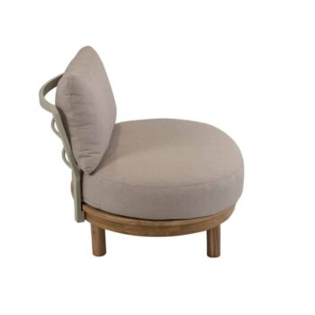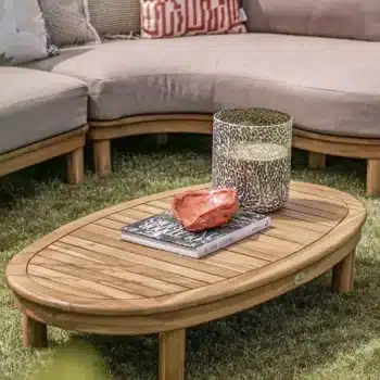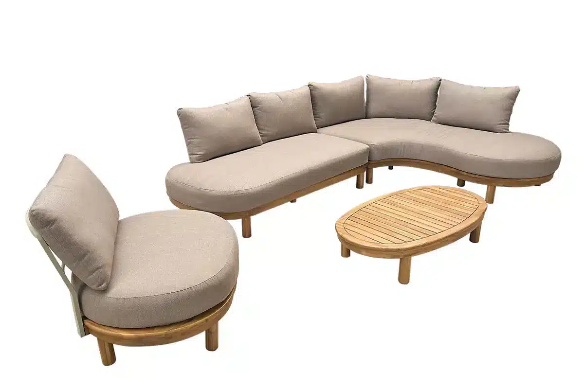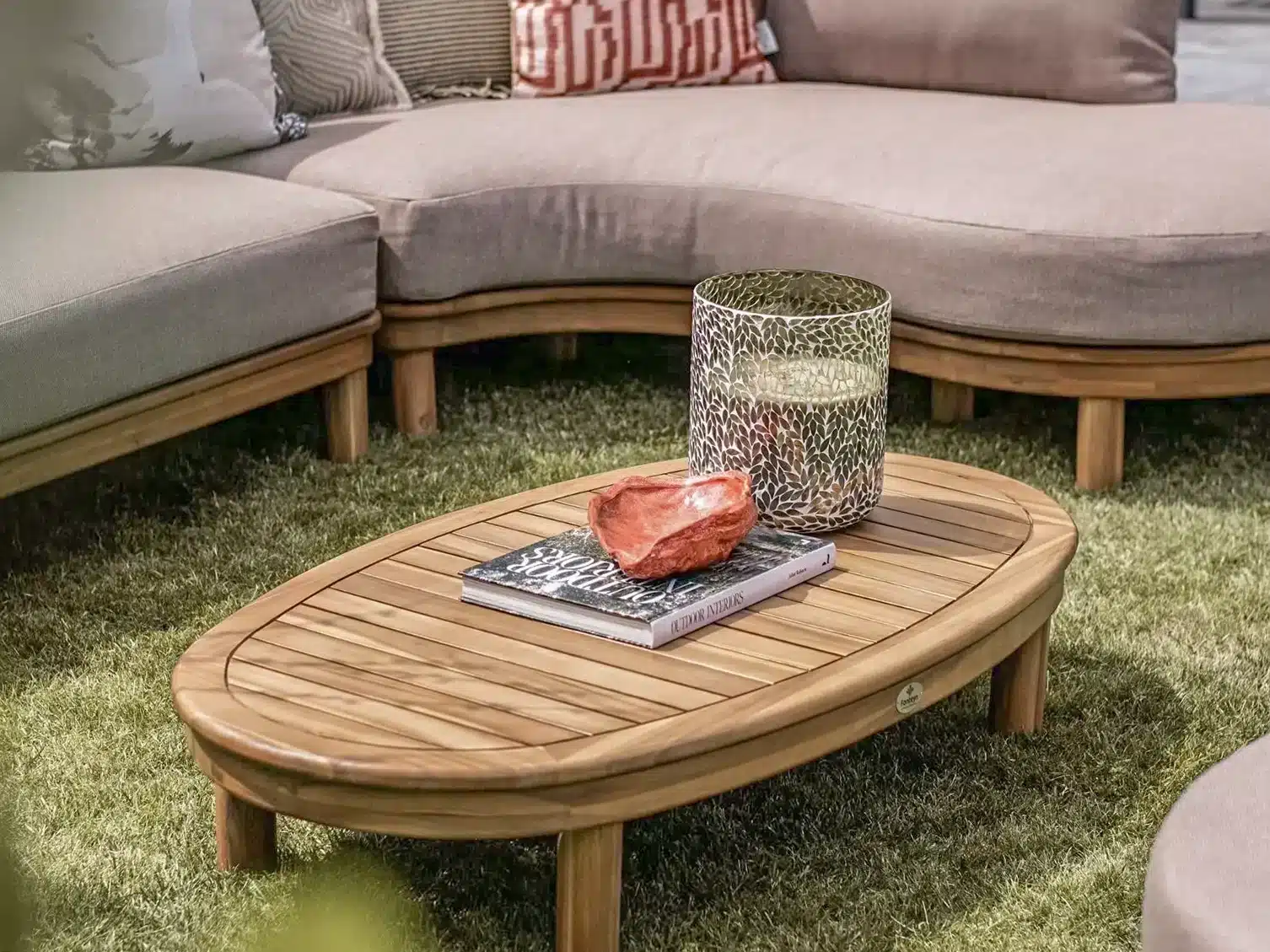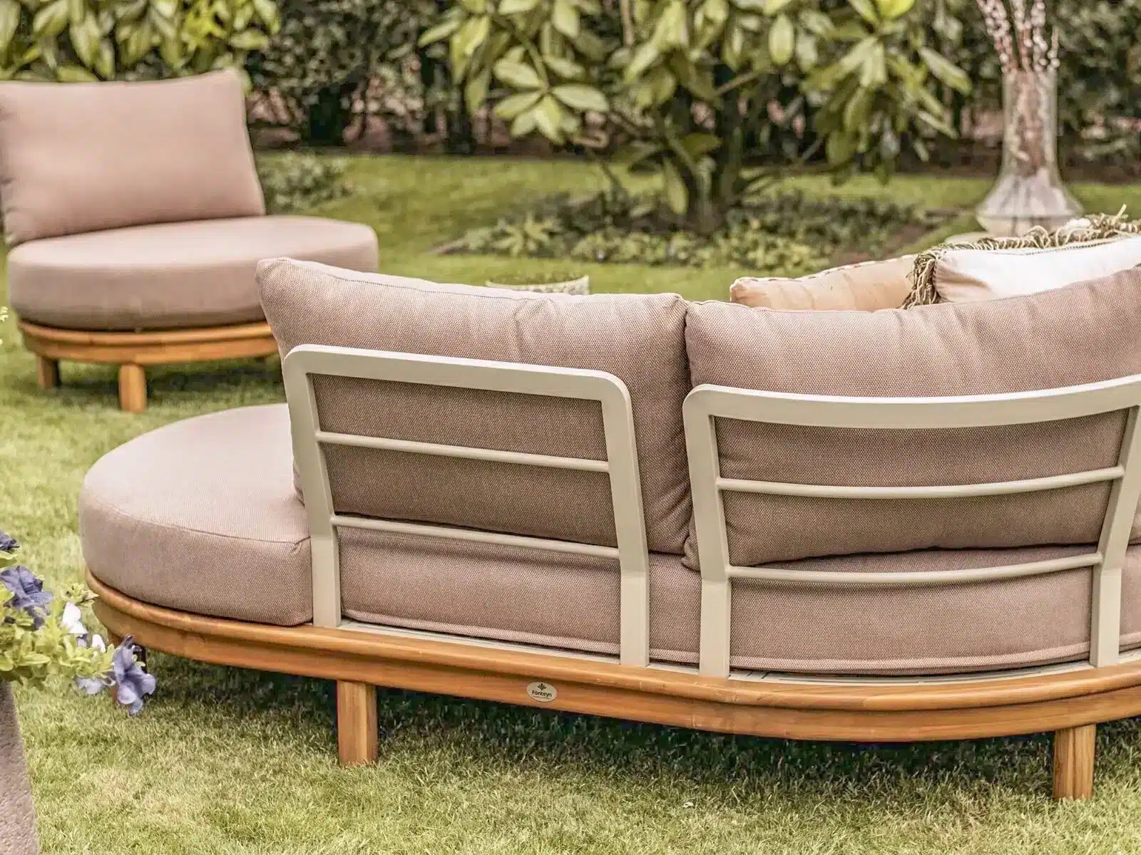 קווים רכים ונמוכים יוצרים תחושת מרחב גם בחצרות קטנות, והשולחן האובלי מאפשר סירקולציה טבעית של תנועה.