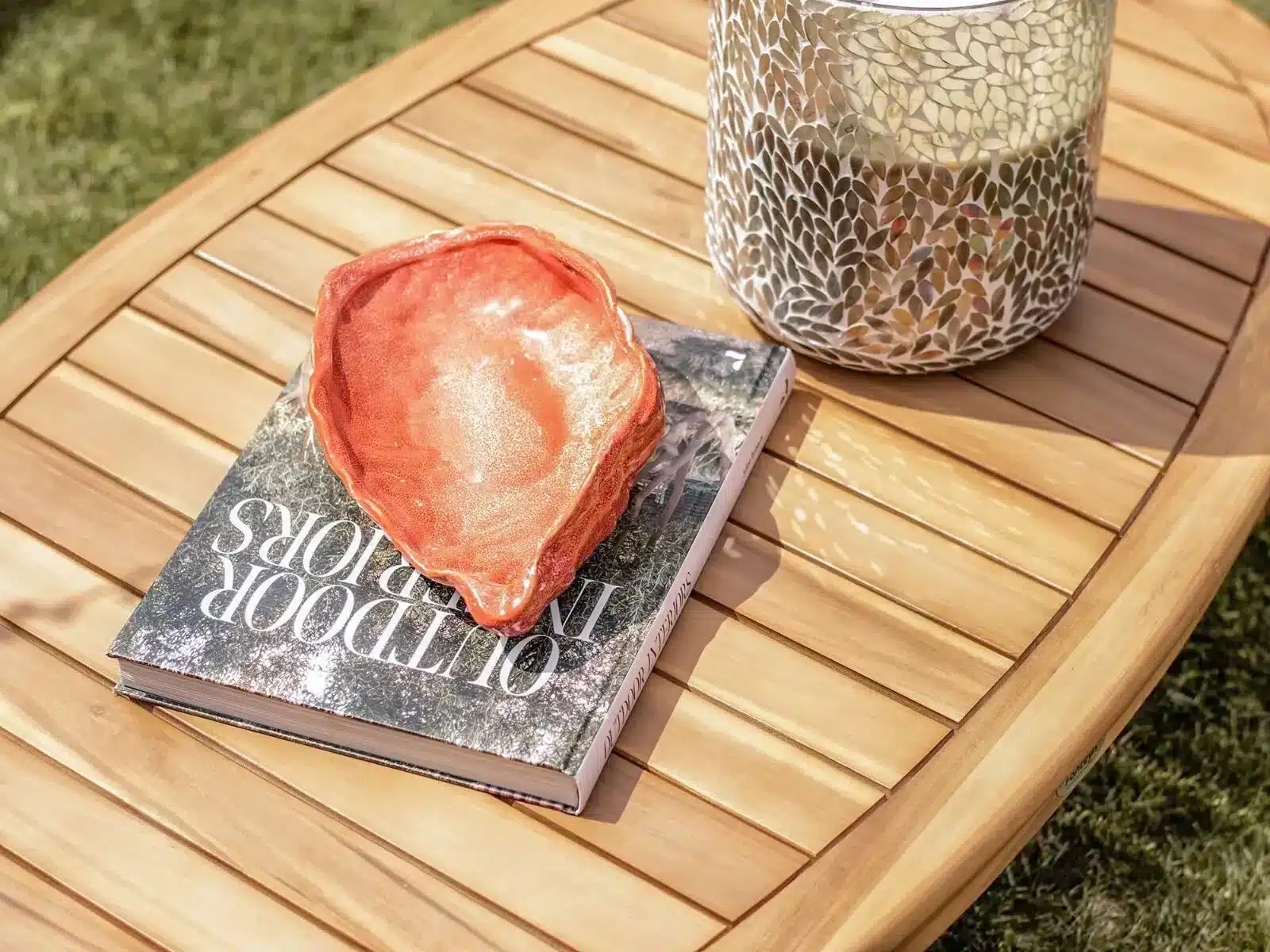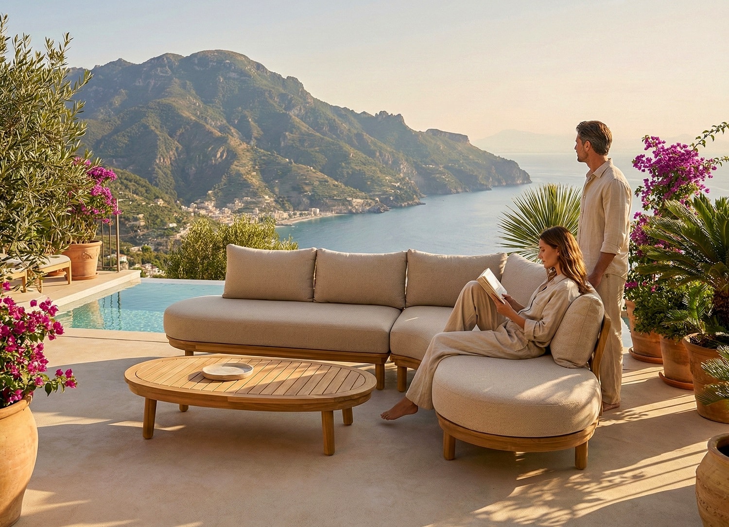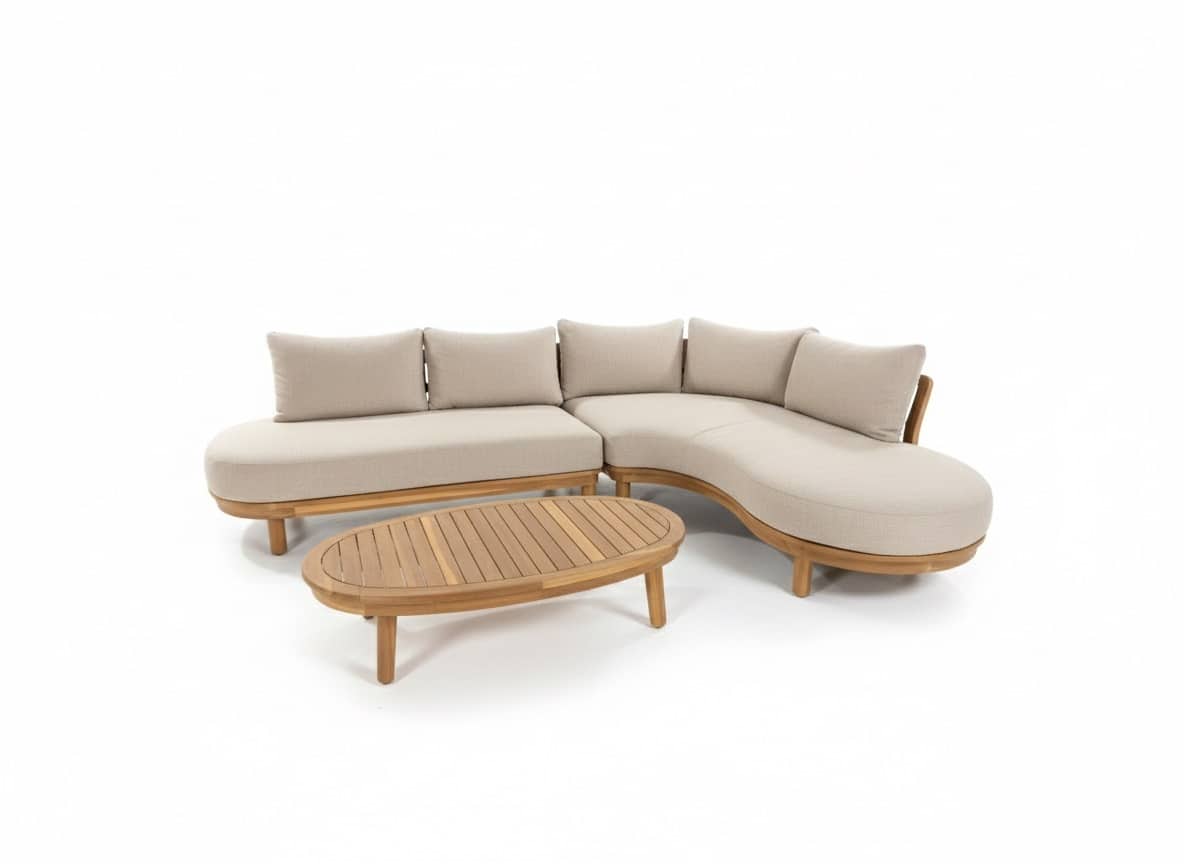 קווים רכים ונמוכים יוצרים תחושת מרחב גם בחצרות קטנות, והשולחן האובלי מאפשר סירקולציה טבעית של תנועה.