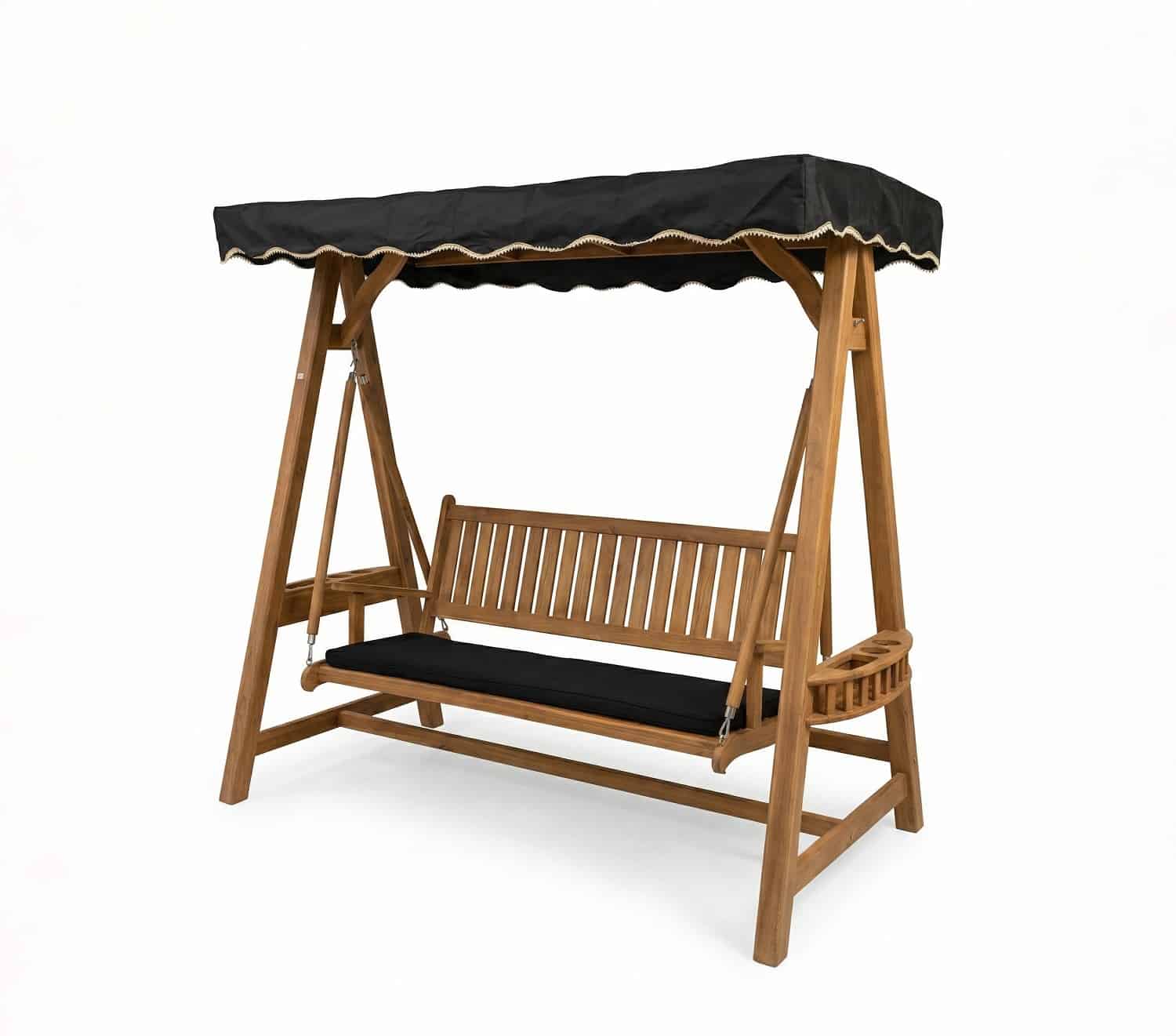 הנדנדה כוללת מדפי צד עם מתקני כוסות.