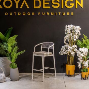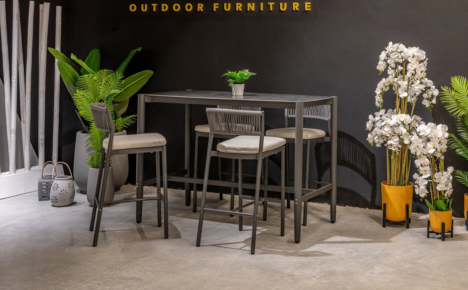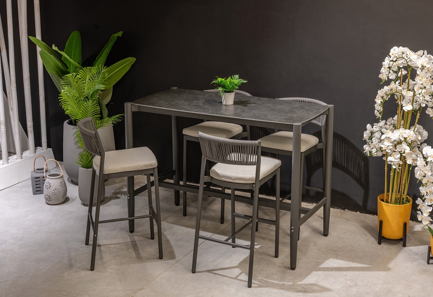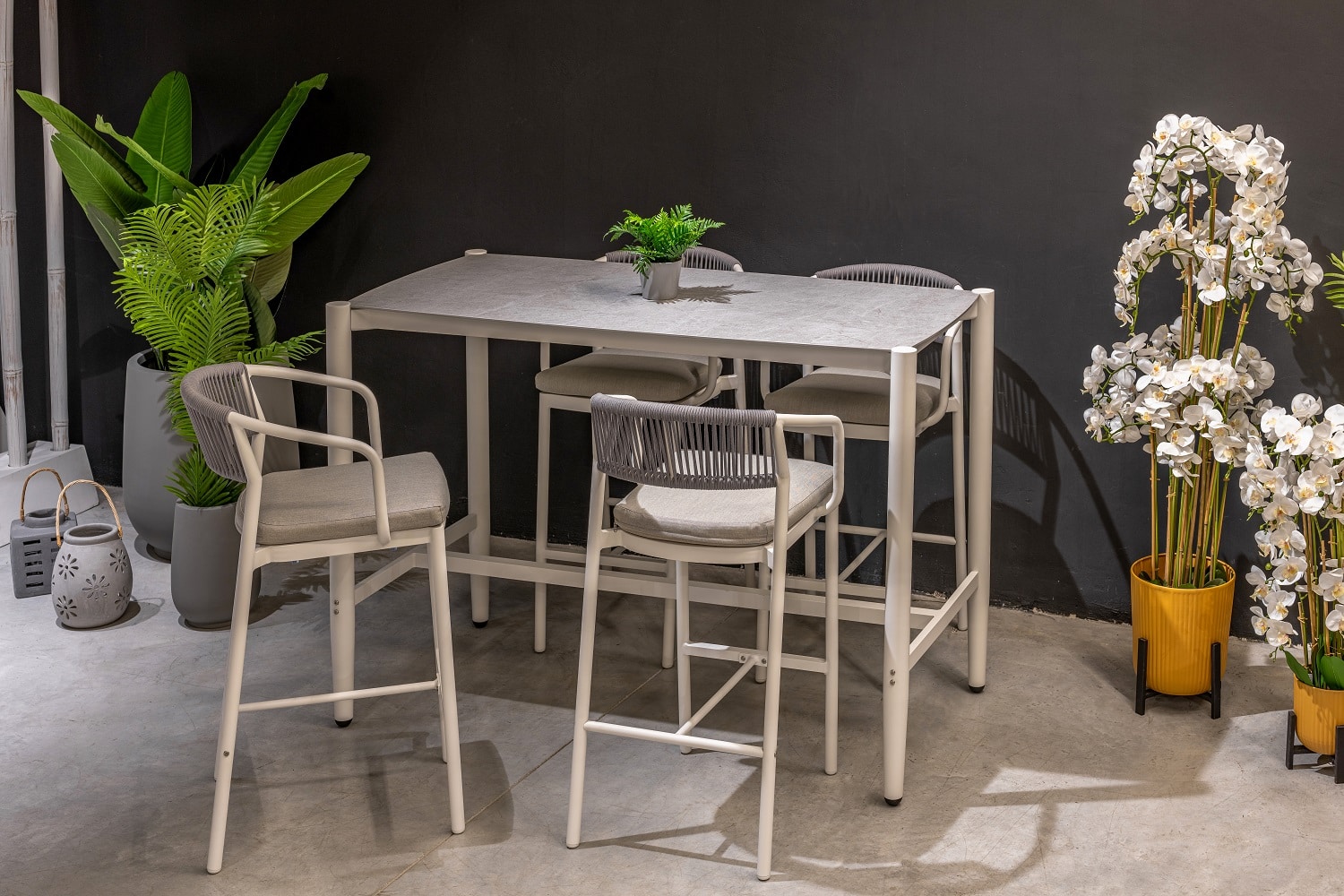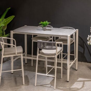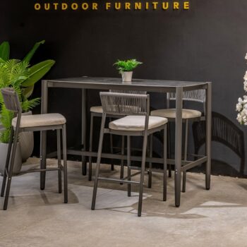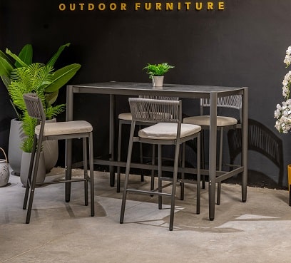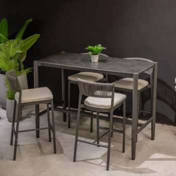 המערכת כוללת שולחן + 4 כיסאות בר ללא משענות ידיים.