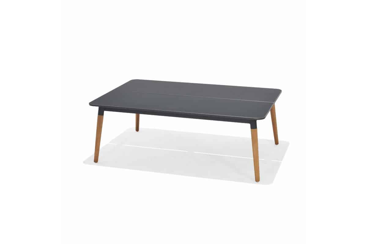 שולחן מלבני עם משטח אלומיניום עליון.