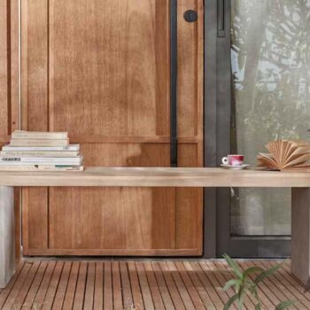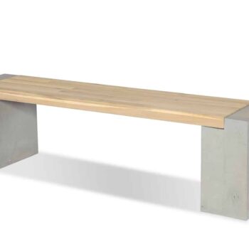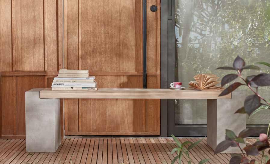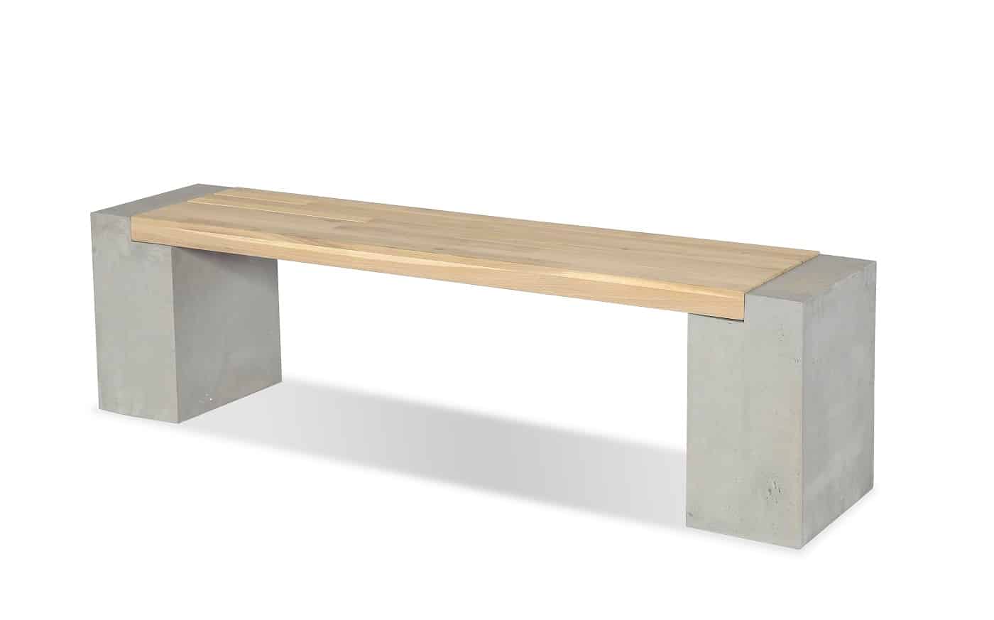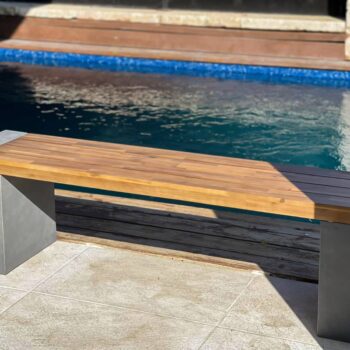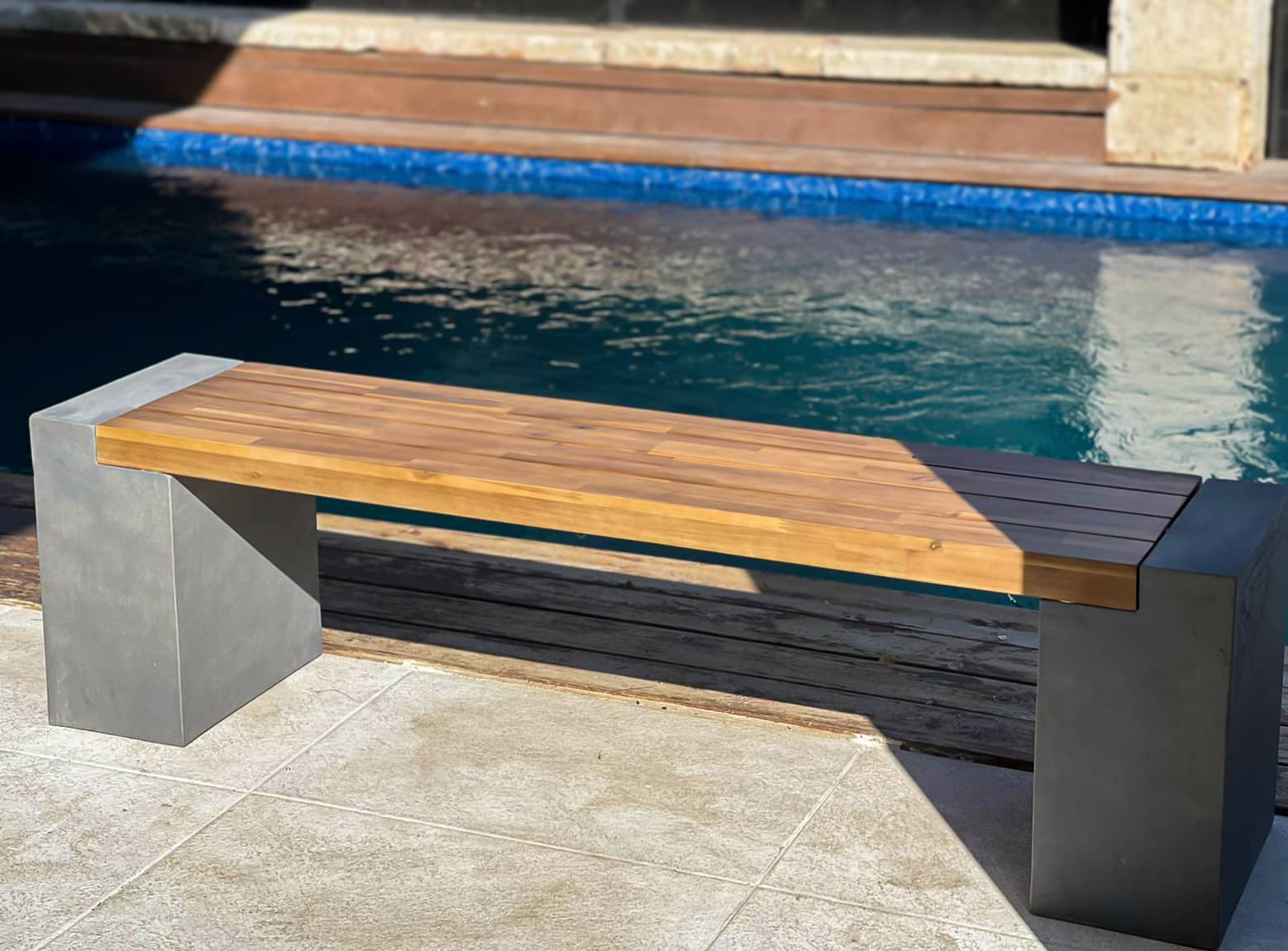 רגלי תרכובת בטון חזקות בשילוב מושב עץ שיטה מלא בגימור עץ טיק מיושן.