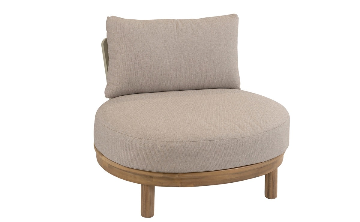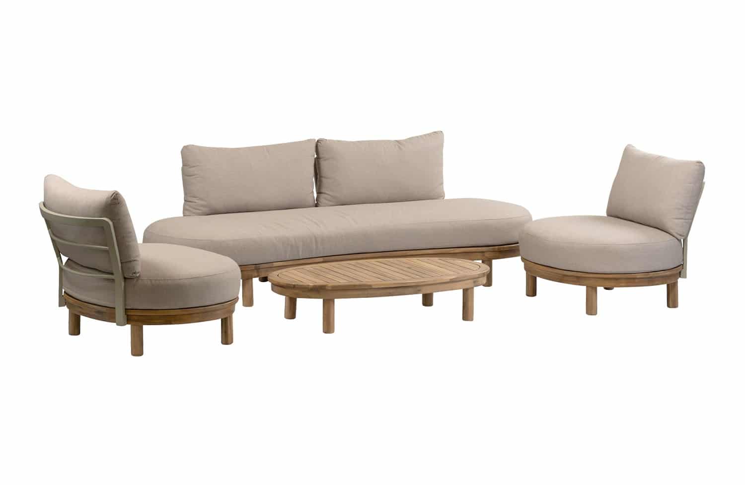 ספה מפוארת לחללי חוץ, בקווים עגולים ורכים, בגימור טבעי שמביא איזון בין נוחות לבין מראה מעוצב ומעודכן.