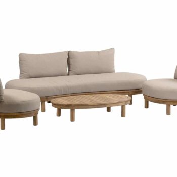 הבסיס עשוי עץ שיטה מלא בגימור טיק בהיר, עם רגליים מעוגלות שמעניקות תחושת קלילות במיוחד בשילוב גב המערכת אשר עשוי אלומיניום “אל חלד” בגוון אבן.