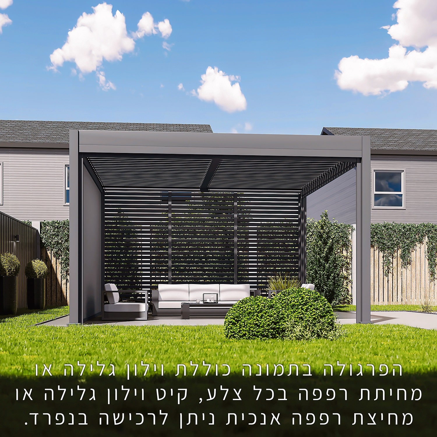 פרגולה חזקה ועמידה במיוחד הבנויה מאלומיניום בשילוב רפפה מאלומיניום “אל חלד”.