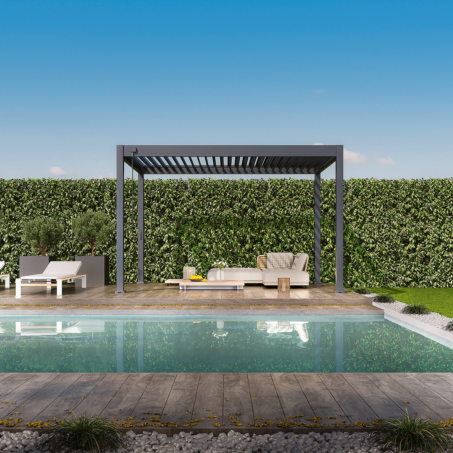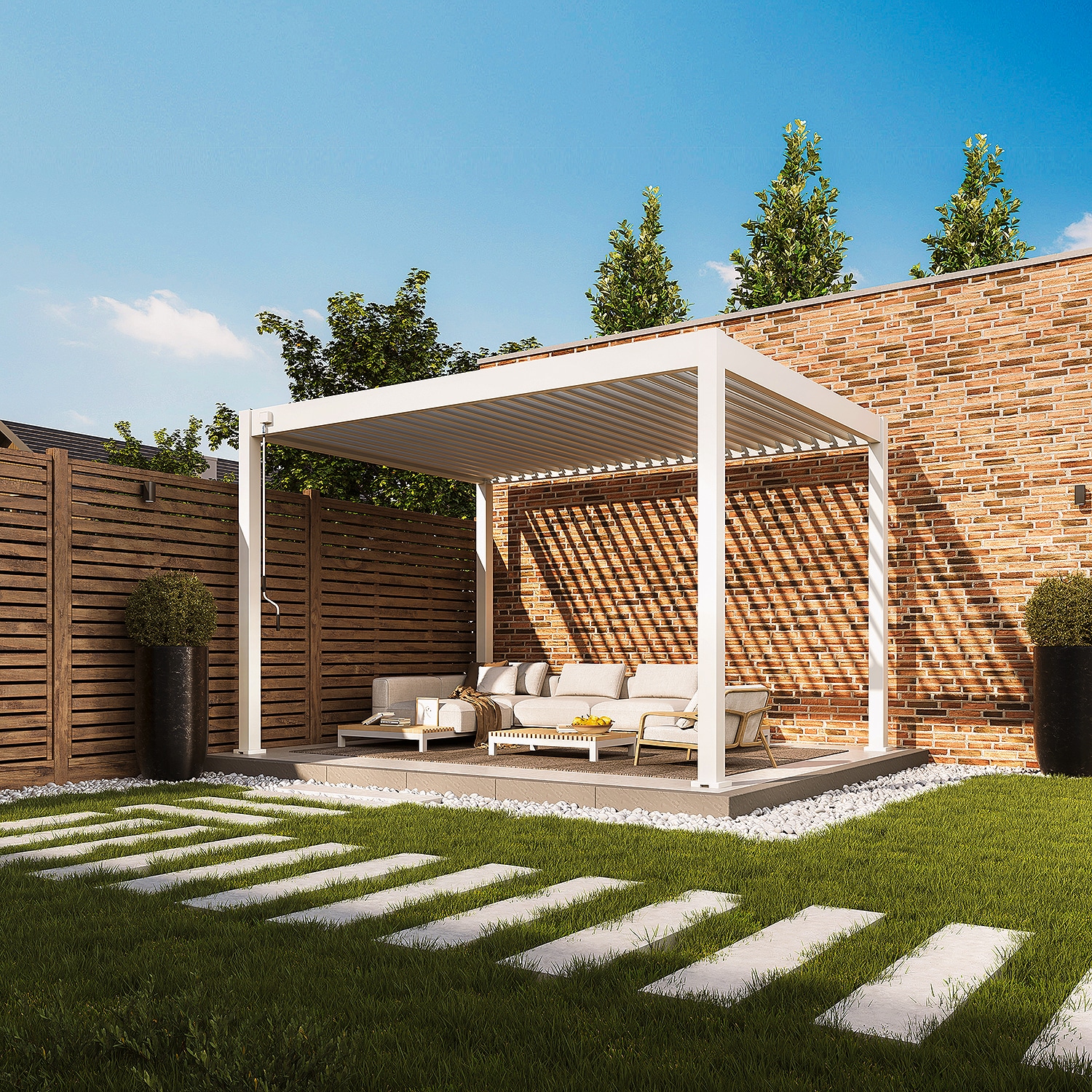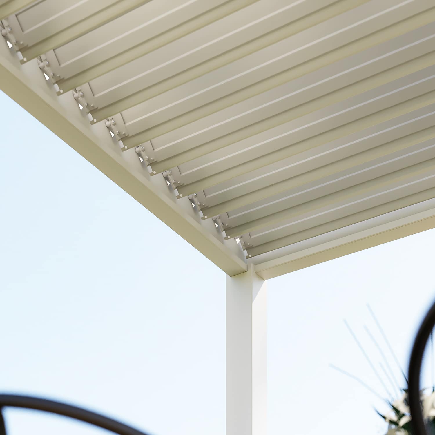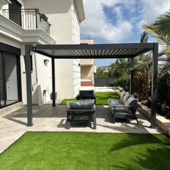 פרגולה חזקה ועמידה במיוחד הבנויה מאלומיניום בשילוב רפפה מתכת צבועה בתנור לשיפור חוזק המבנה ועמידותו.