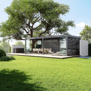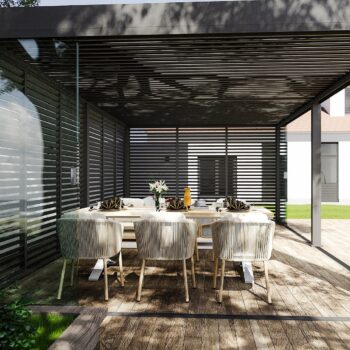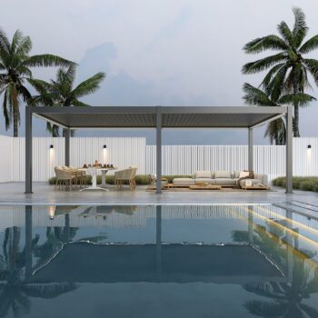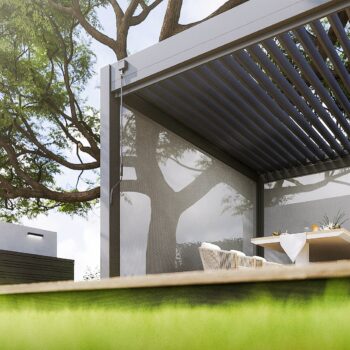 פרגולה חזקה ועמידה במיוחד הבנויה מאלומיניום בשילוב רפפה עשויה מאלומיניום “אל חלד”.