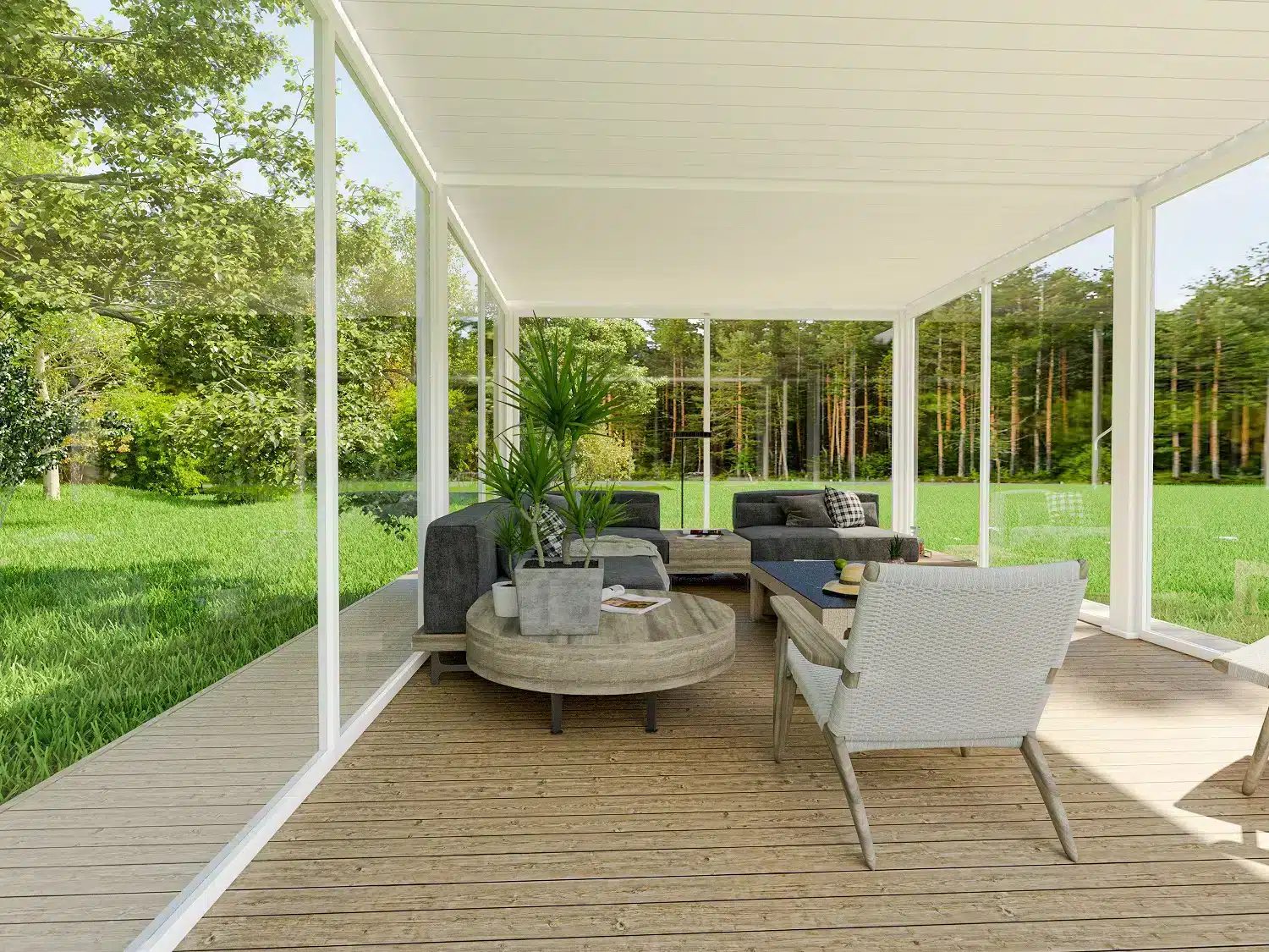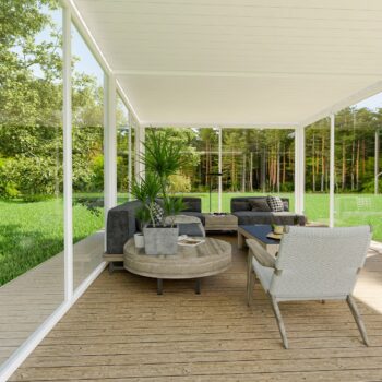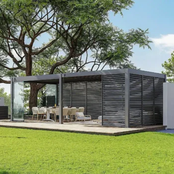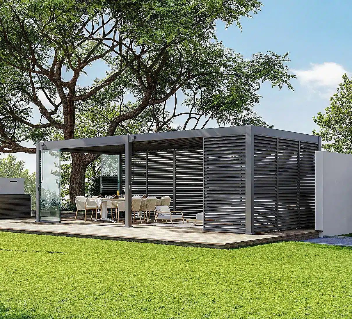 הפרגולה אינה כוללת קירות צד, רפפות צד או וילונות. ניתן להוסיף.