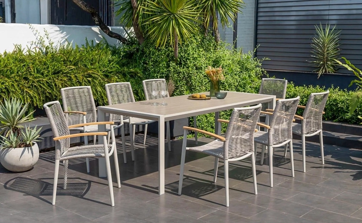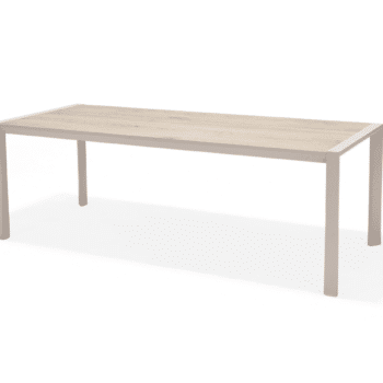 הפינה כוללת שולחן מלבי באורך 207 ס”מ עם משטח DuraBoard: חומר מרוכב מתקדם המדמה עץ טבעי, עמיד במיוחד בפני מזג אוויר, שריטות ולכלוך, ואינו דורש תחזוקה.