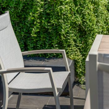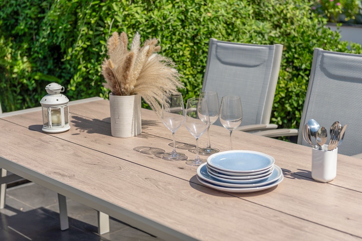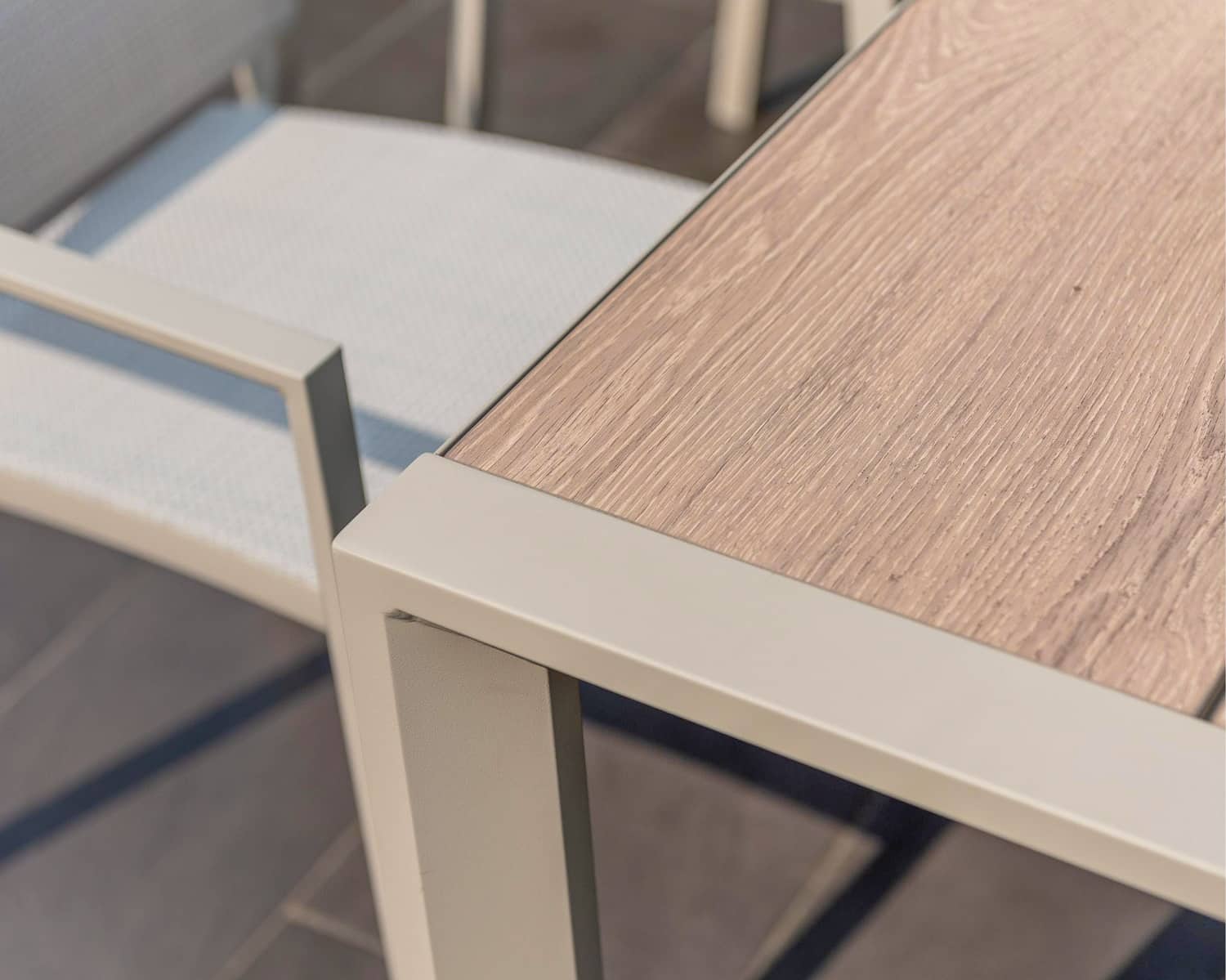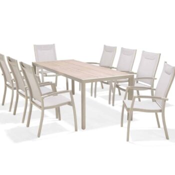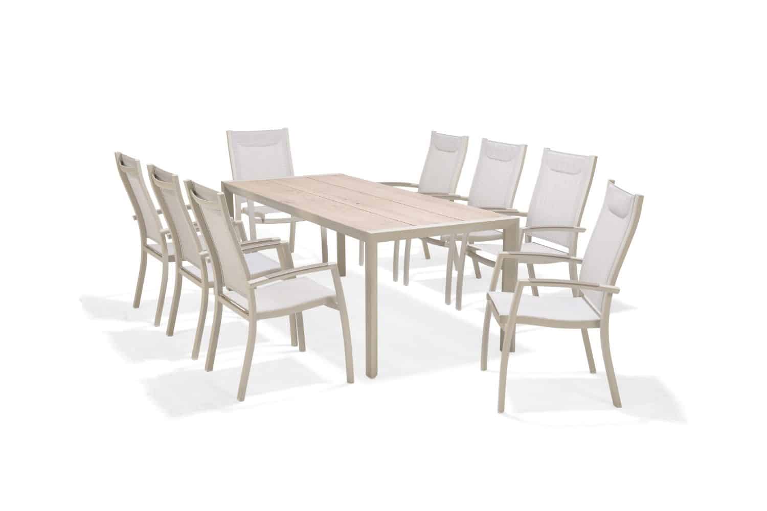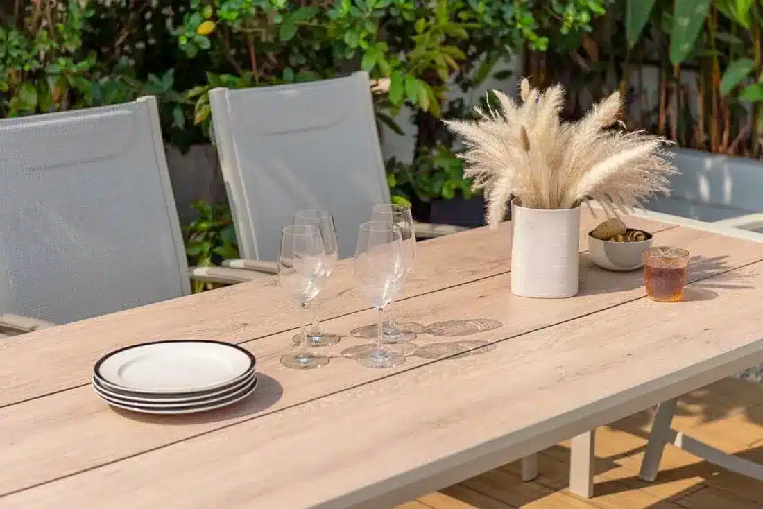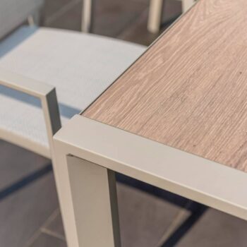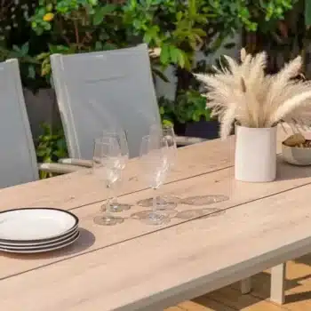 הפינה כוללת שולחן מלבי באורך 207 ס”מ עם משטח DuraBoard: חומר מרוכב מתקדם המדמה עץ טבעי, עמיד במיוחד בפני מזג אוויר, שריטות ולכלוך, ואינו דורש תחזוקה.