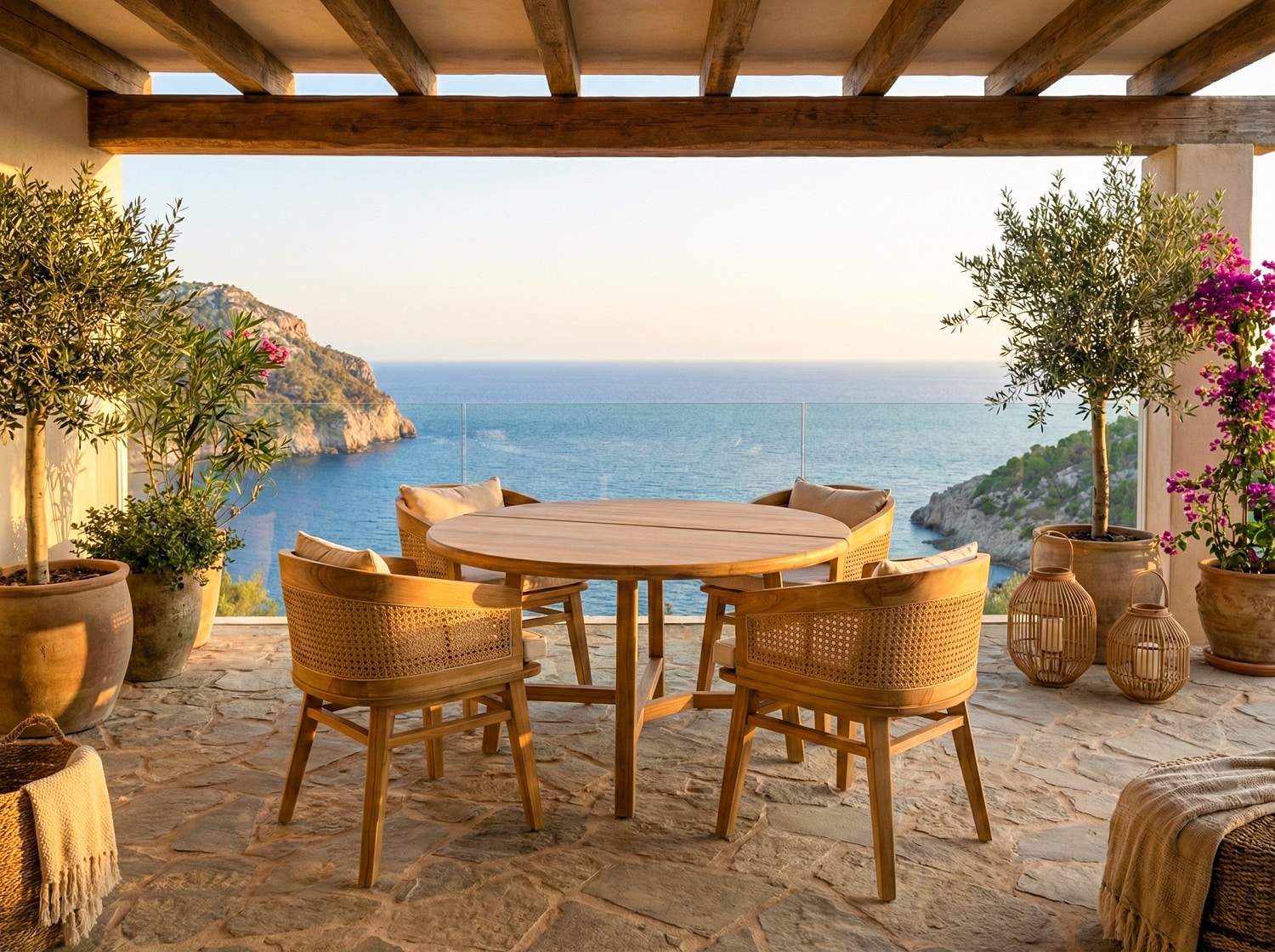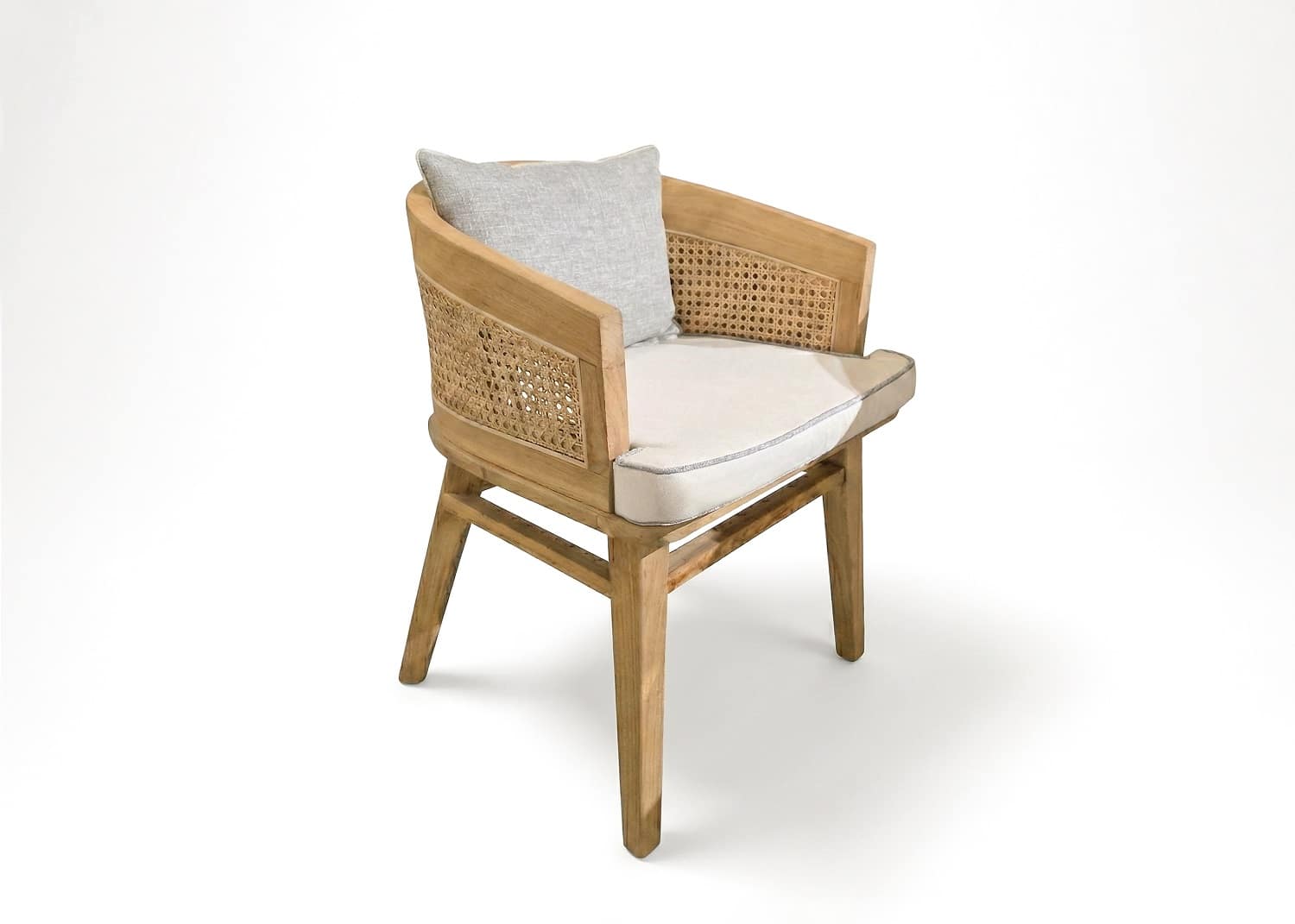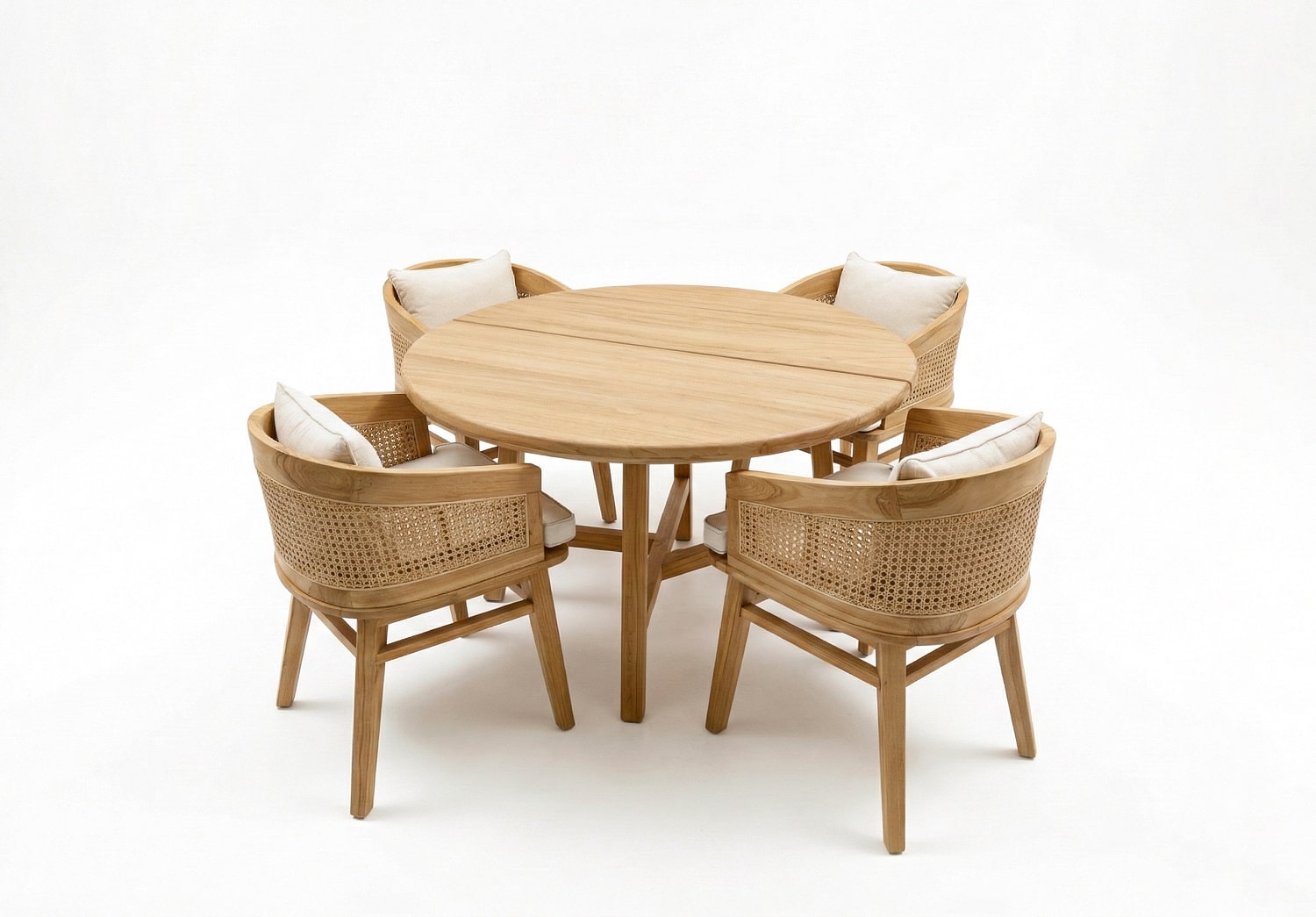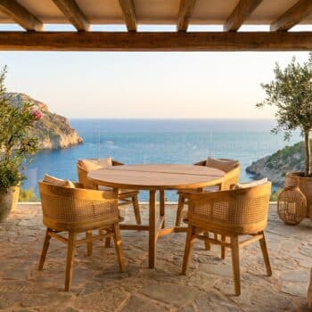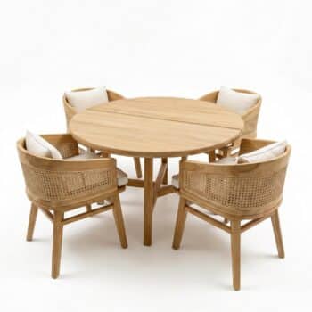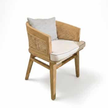 הכיסאות בנוים מעץ טיק מלא בשילוב ראטן טבעי.