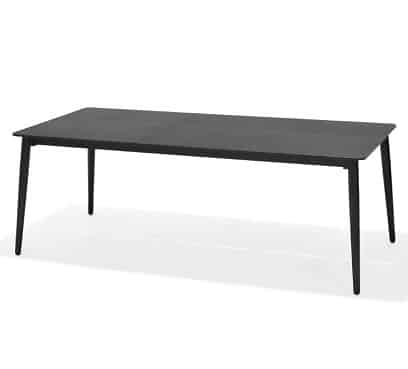 השולחן בנוי משלדת אלומיניום “אל חלד” בשילוב לוחות דמוי עץ שחור.