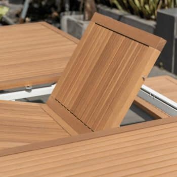 השולחן בנוי משלדת אלומיניום “אל חלד” בשילוב לוחות עץ אקליפטוס FSC.