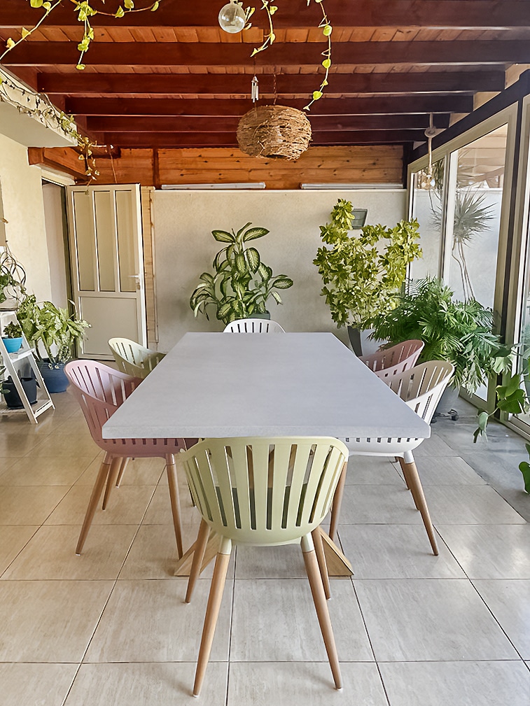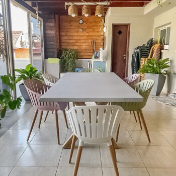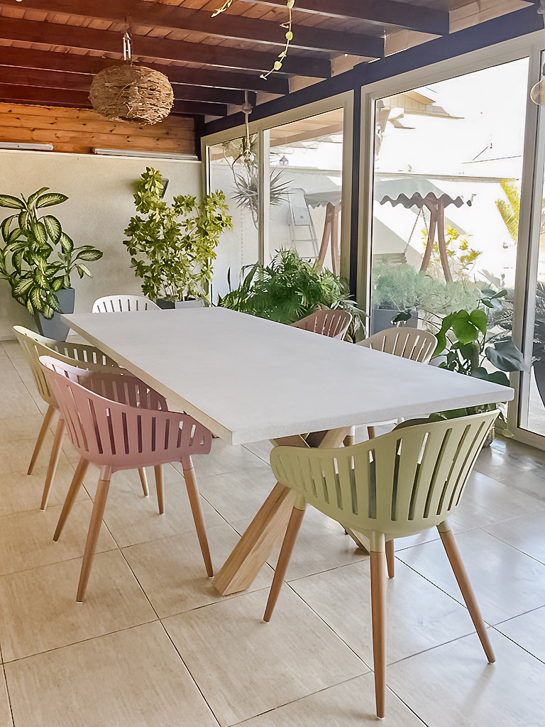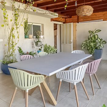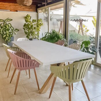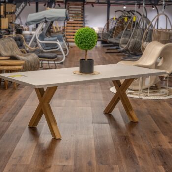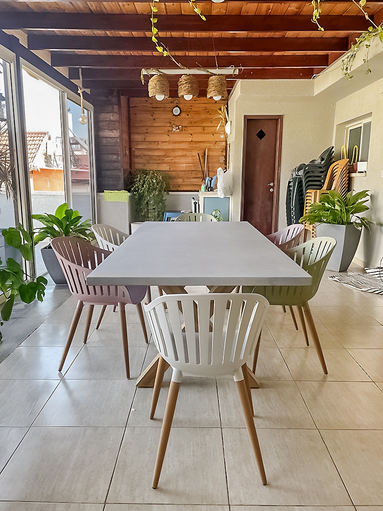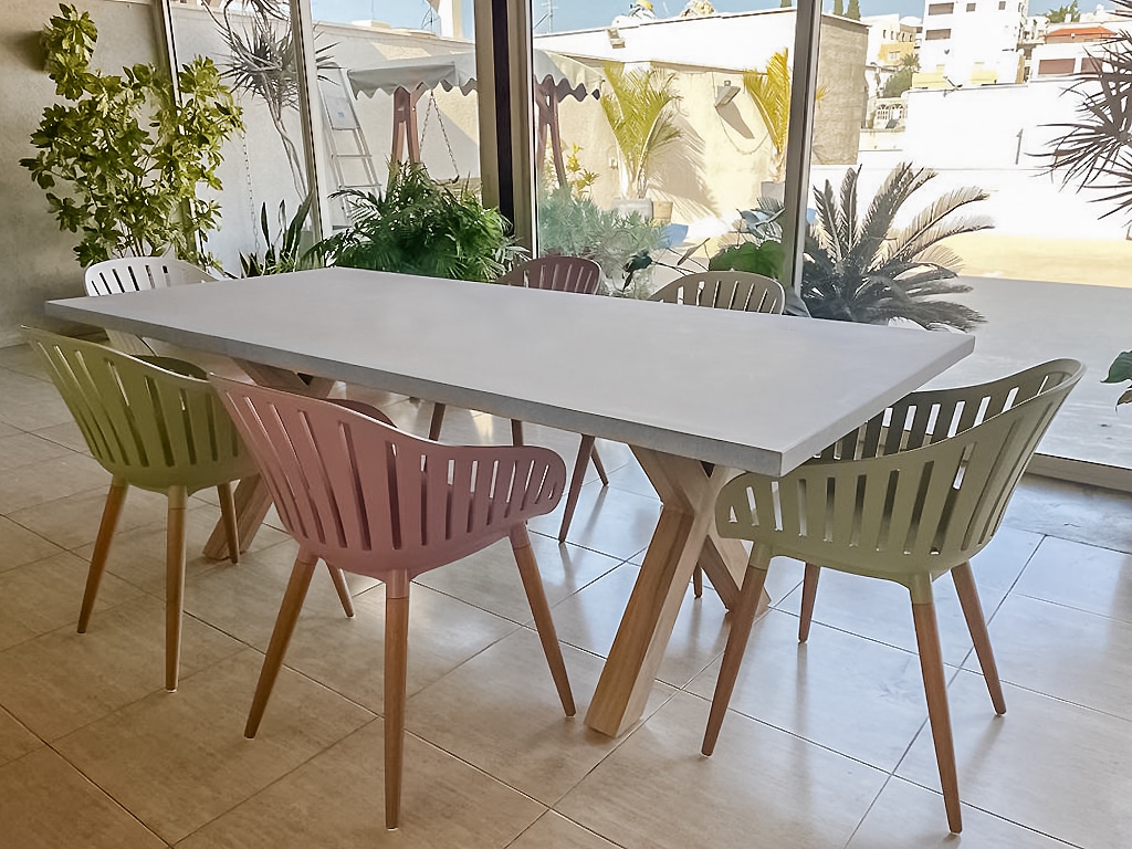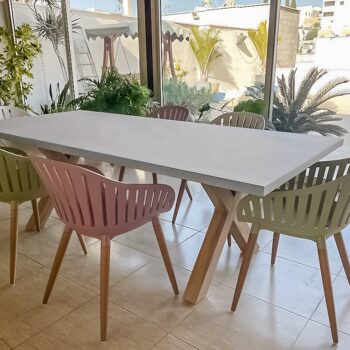 שולחן יוקרתי במיוחד הבנוי מרגלי אלומיניום “דמוי עץ” בשילוב פלטת בטון מחוזק פיברגלס.