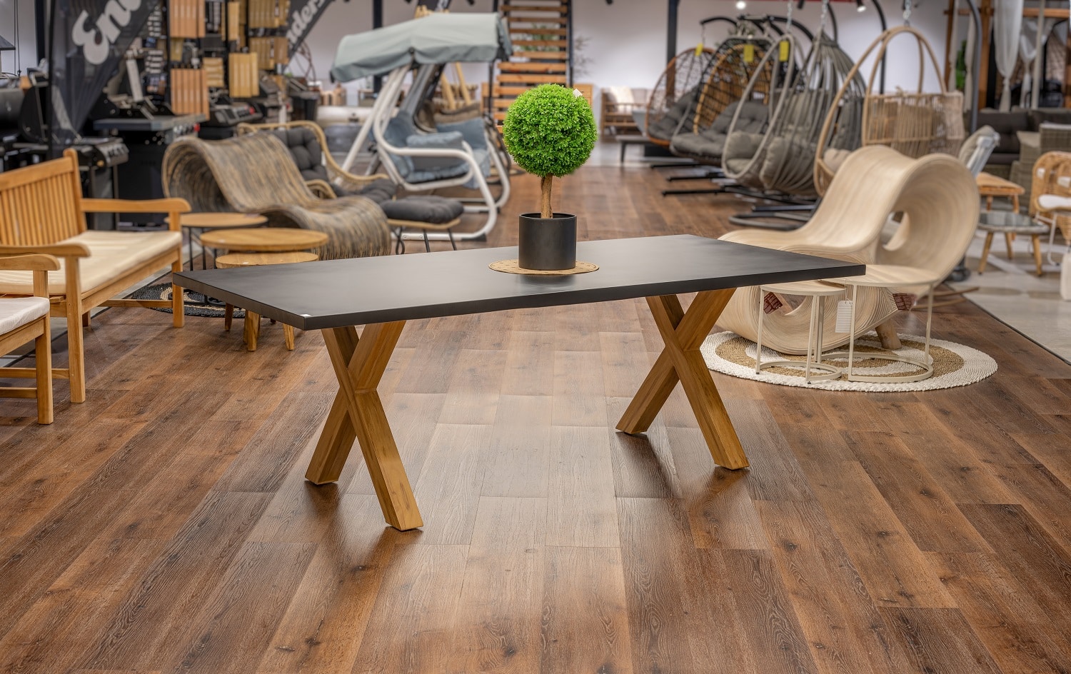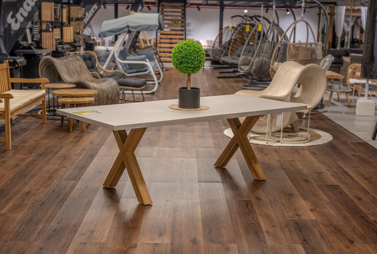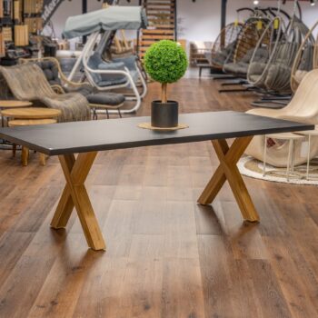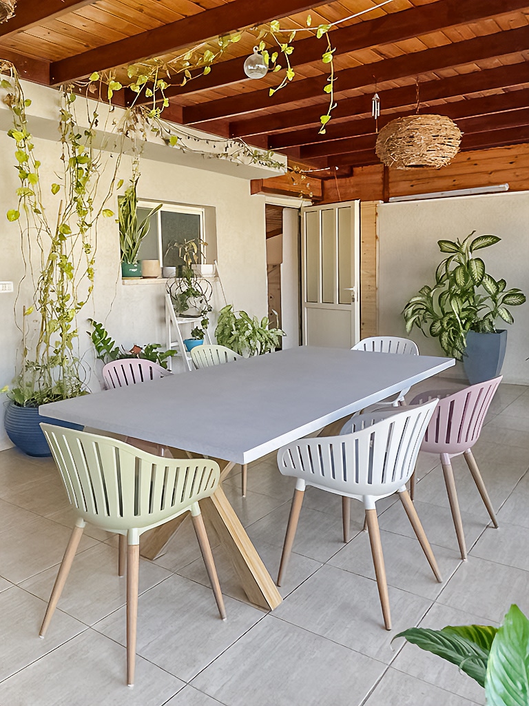 שולחן יוקרתי במיוחד הבנוי מרגלי אלומיניום “דמוי עץ” בשילוב פלטת בטון מחוזק פיברגלס.