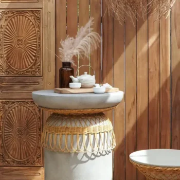 עשוי מתרכובת בטון חזקה בשילוב קישוט שזירה מראטן טבעי.