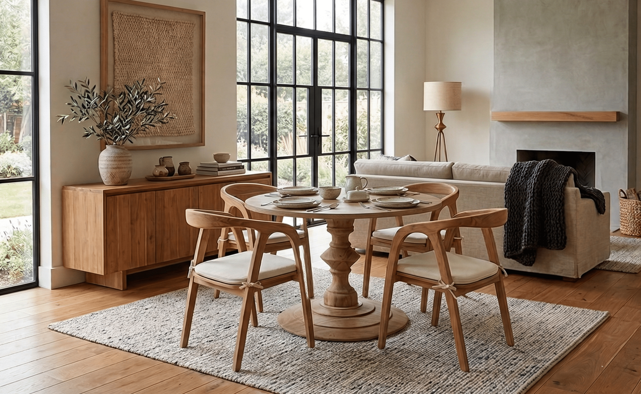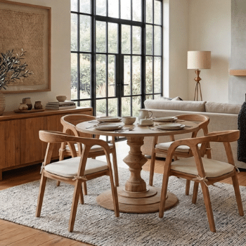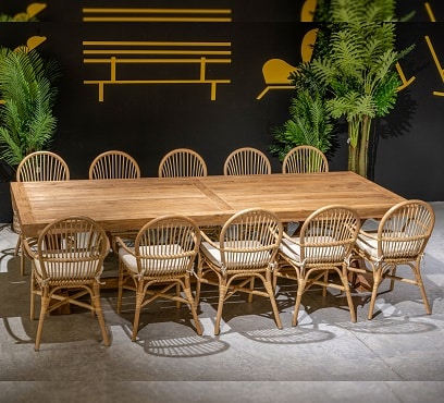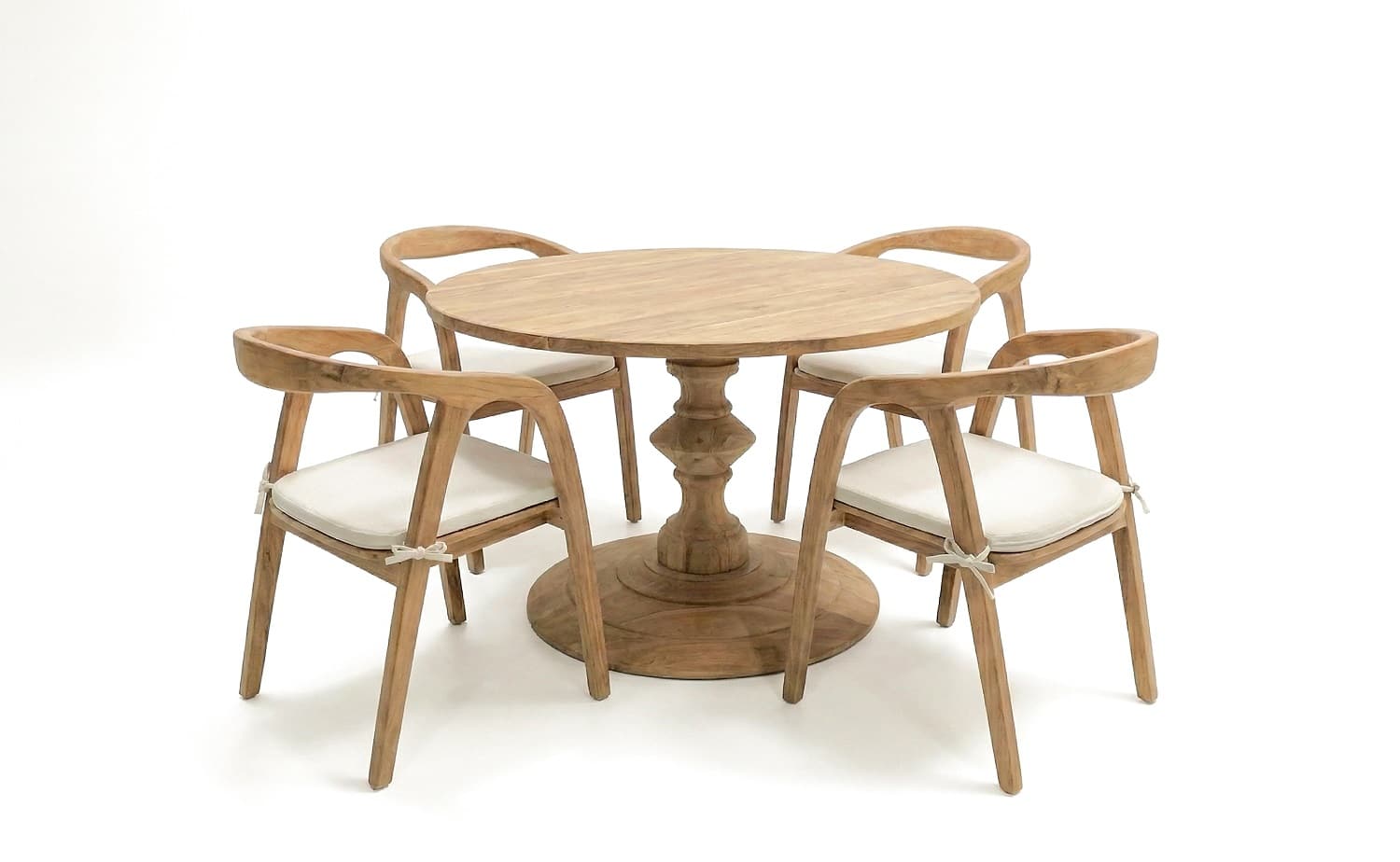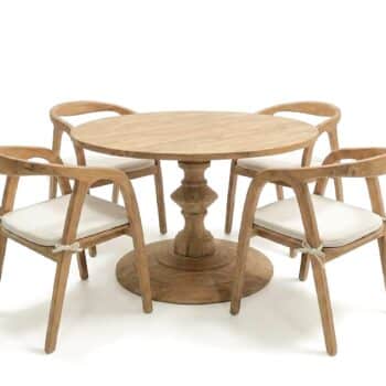 השולחן והכיסאות בנויים מעץ טיק אינדונזי מלא.