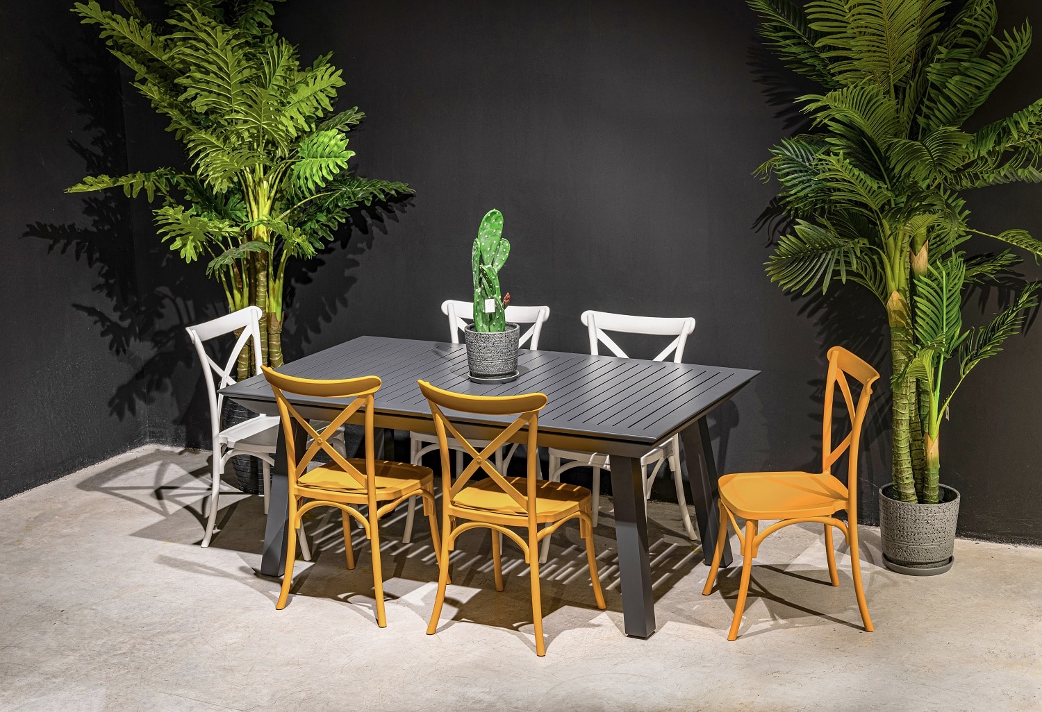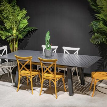 שולחן נפתח העשוי אלומיניום “אל חלד” במידה 175*100 ס”מ, נפתח ל-240 ס”מ.
