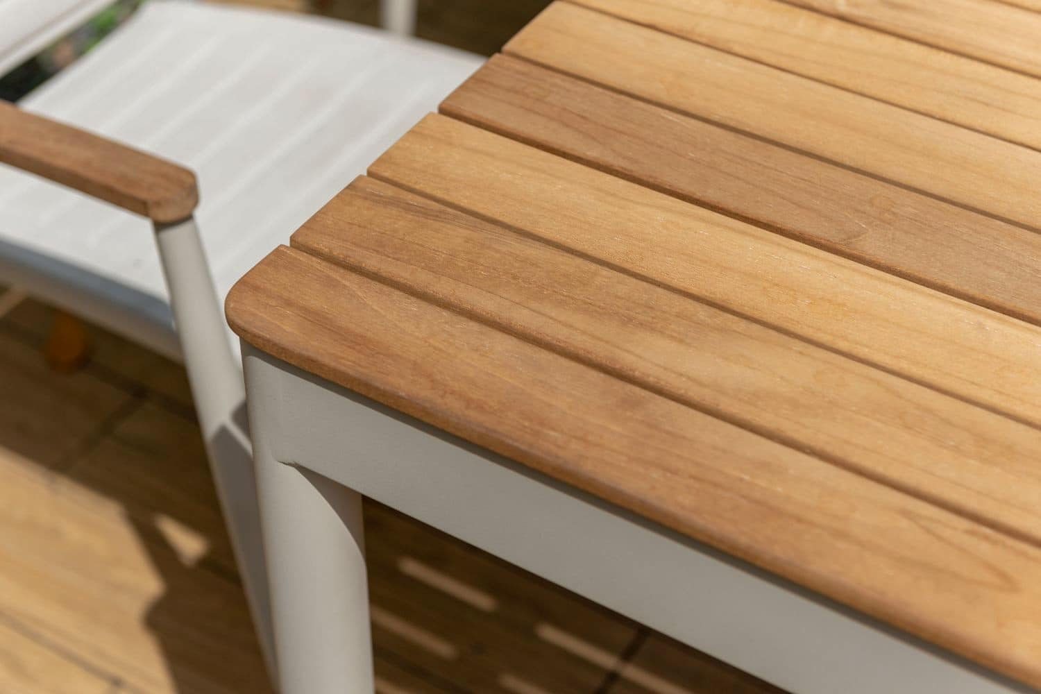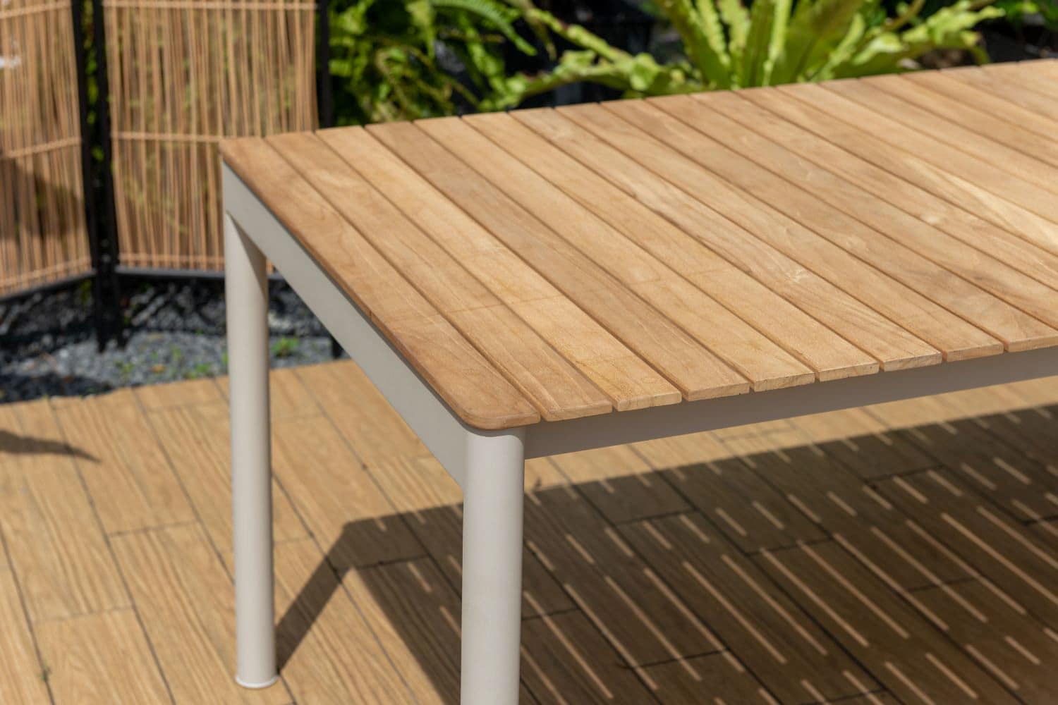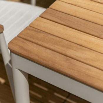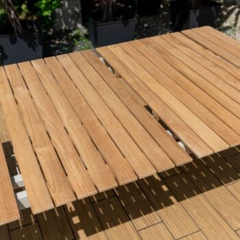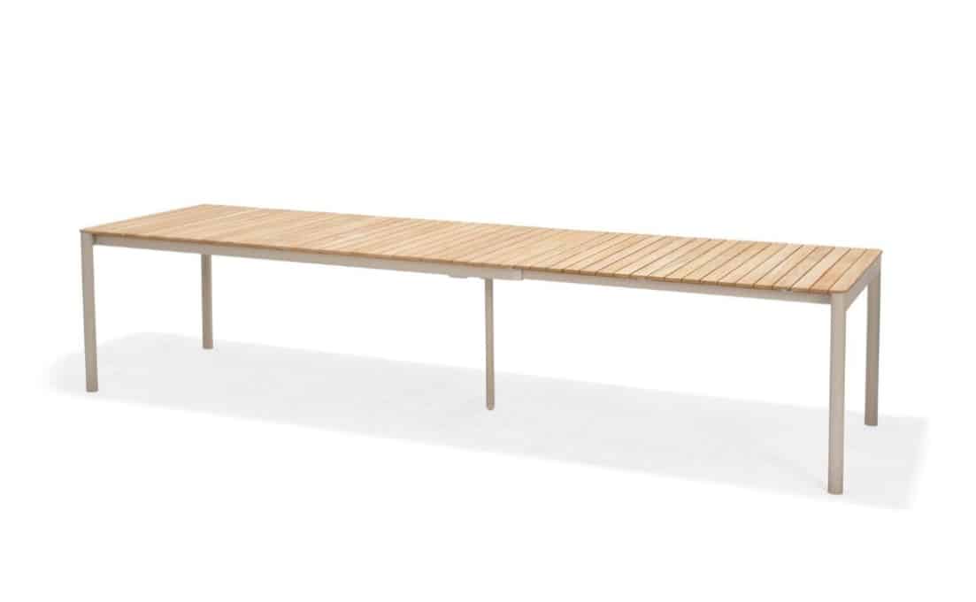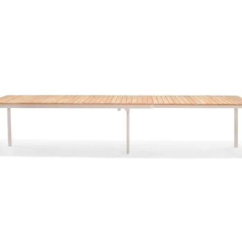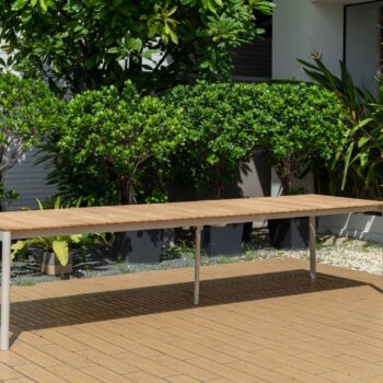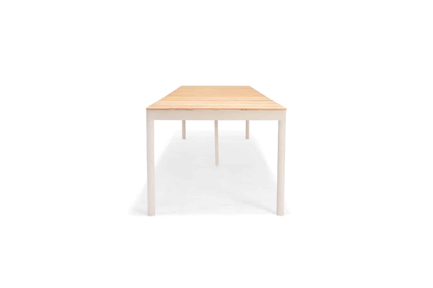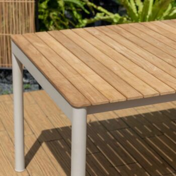 השולחן המלבני של סדרת טופז משלב שלדת אלומיניום בגוון אבן “אל חלד” עם פלטת עץ טיק טבעי באיכות גבוהה ובעלת תו תקן FSC.