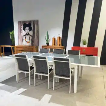 שולחן האוכל בנוי מאלומיניום “אל חלד” מחוזק עם הגנה ותמיכה במסגרת השולחן.