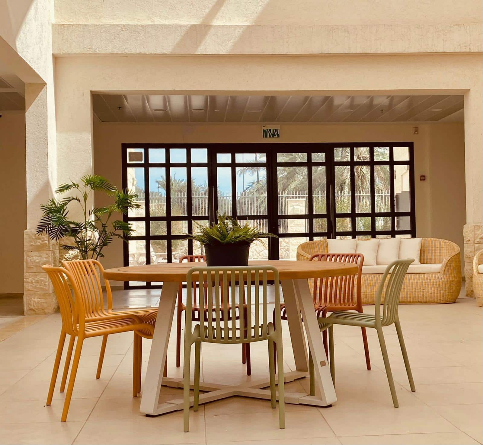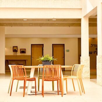 כיסא פלסטיק יצוק בעל גב מעוצב התורם לנוחות ואוורור.